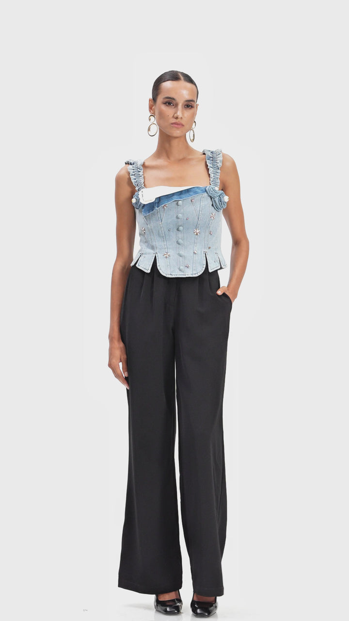 The Cleon Embellished Corset Denim Top expertly combines classic denim with refined detailing for a contemporary silhouette. Designed with a structured corset fit, it shapes and enhances the waist while offering sturdy support. Intricate embellishments add a sophisticated touch, elevating this piece beyond everyday denim. Ideal for pairing with high-waisted bottoms, it delivers both style and confidence with a tailored edge.