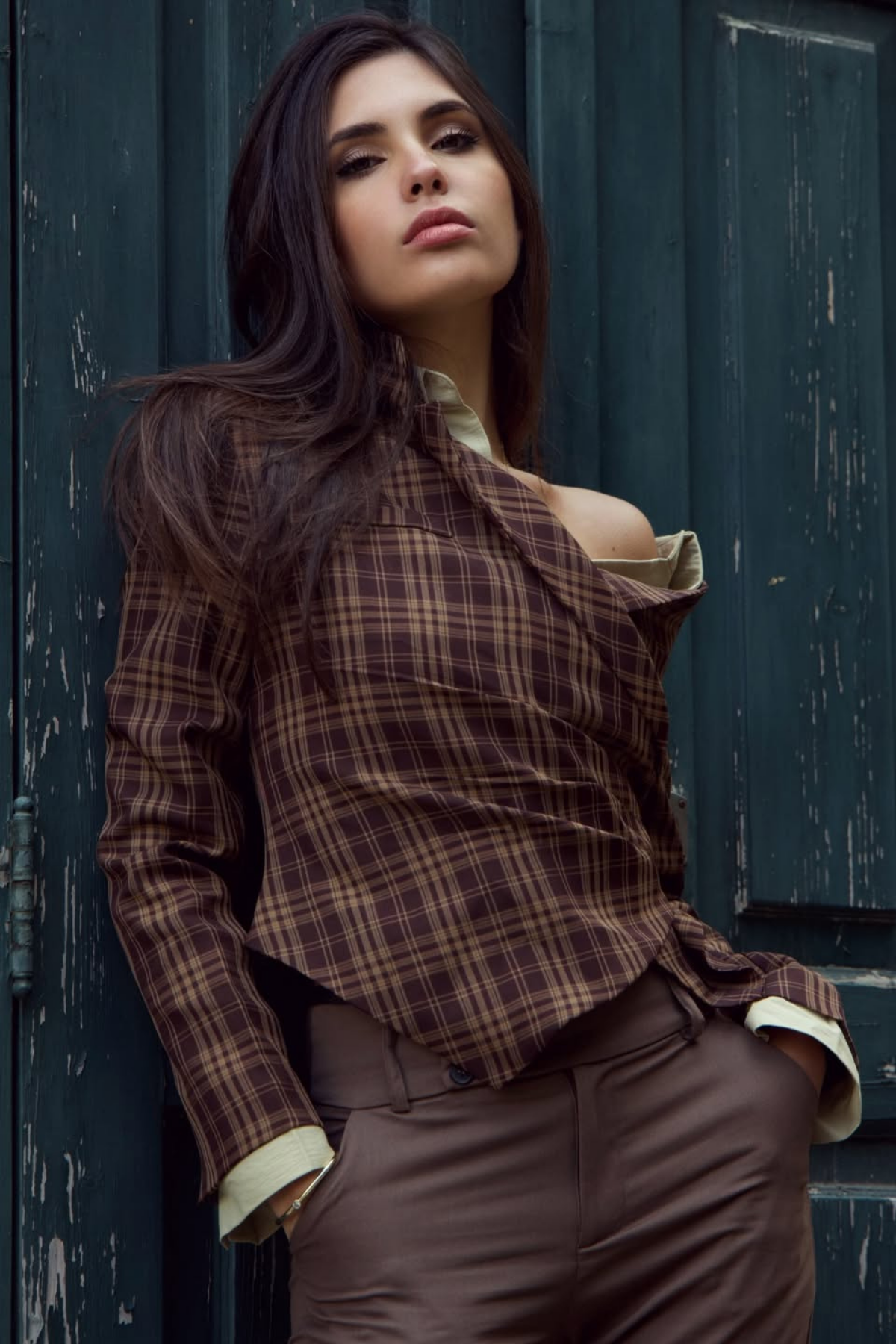 The Darko One Shoulder Grid Top in Brown offers a sophisticated asymmetrical design with a bold grid pattern, combining modern structure and classic elegance. Crafted to highlight the shoulder with a sleek single-strap silhouette, this top enhances your profile while providing a refined, tailored fit. Its rich brown hue complements a variety of outfits, making it an excellent choice for elevating both casual and formal wardrobes. Perfect for those who appreciate contemporary fashion with a minimalist edge.