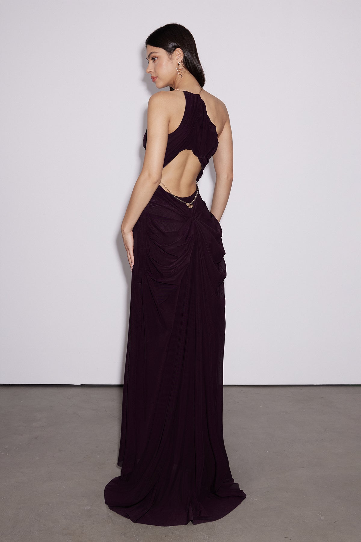 The Davis Plunge Chain Asymmetric Maxi Dress commands attention with its sophisticated silhouette and refined details. The dramatic plunge neckline creates an elegant focal point, while delicate chain accents add contemporary edge to the design. An asymmetric hemline introduces movement and visual intrigue, flattering the figure with its dynamic cut. Rendered in a luxurious deep purple, this maxi dress transitions seamlessly from evening events to upscale occasions. The combination of daring neckline, architectural draping, and jewel-tone color makes this piece a standout choice for those seeking understated glamour with modern sensibility.