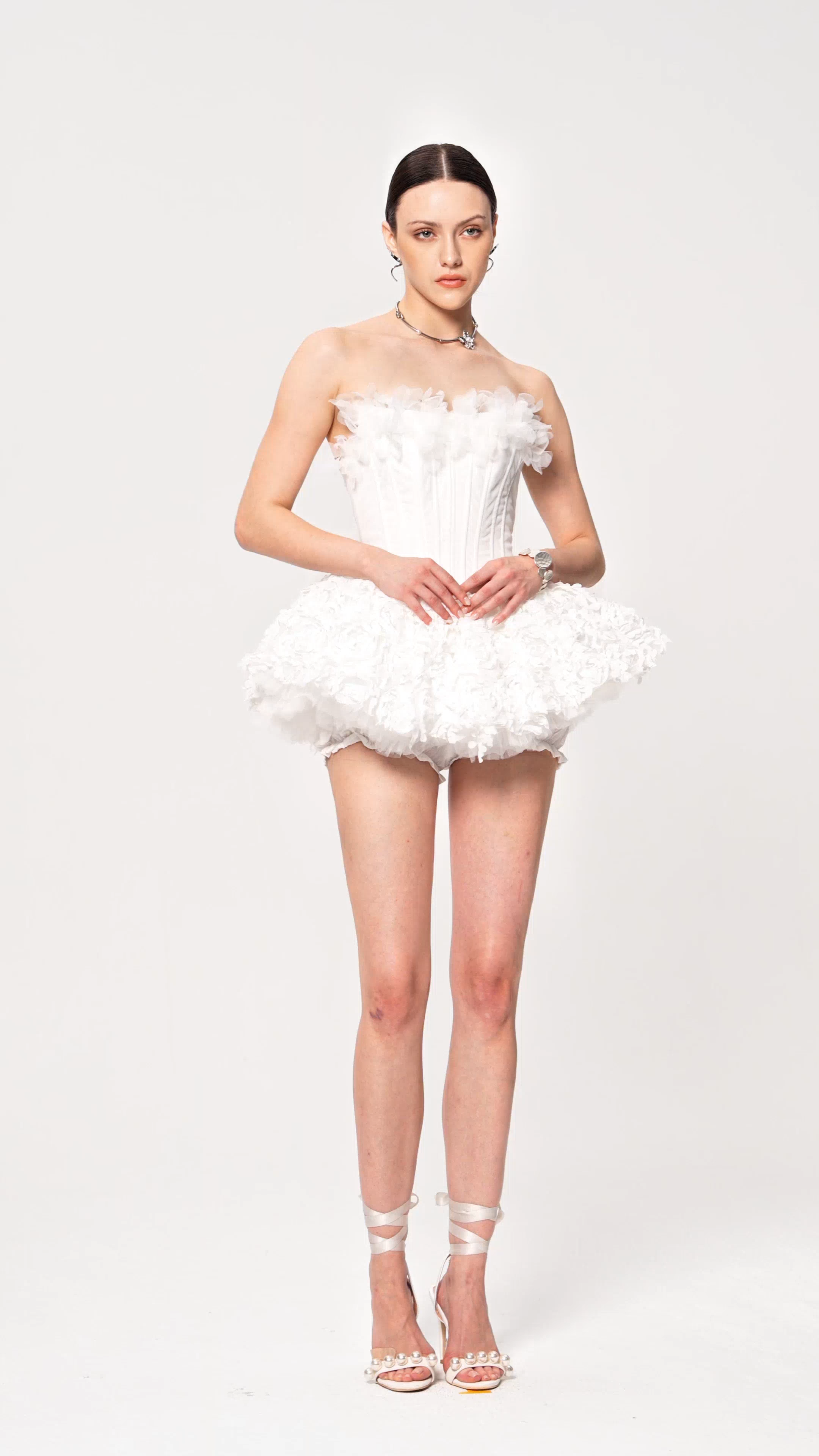 Daxton Corset Flower Puffy Mini Dress In White This striking mini dress combines structured corset tailoring with romantic floral detailing and voluminous puffy sleeves for a sophisticated yet playful silhouette. The fitted bodice provides elegant support and definition, while the delicate flower embellishments add dimension and visual interest. Crafted in crisp white fabric, this piece transitions seamlessly from evening events to upscale casual occasions. The puffy sleeve design creates a contemporary statement, balancing the dress's refined corset construction with modern femininity. Perfect for those seeking a dress that commands attention through thoughtful design rather than simplicity.