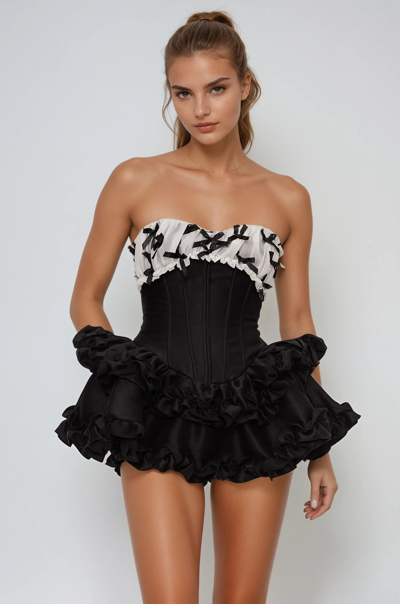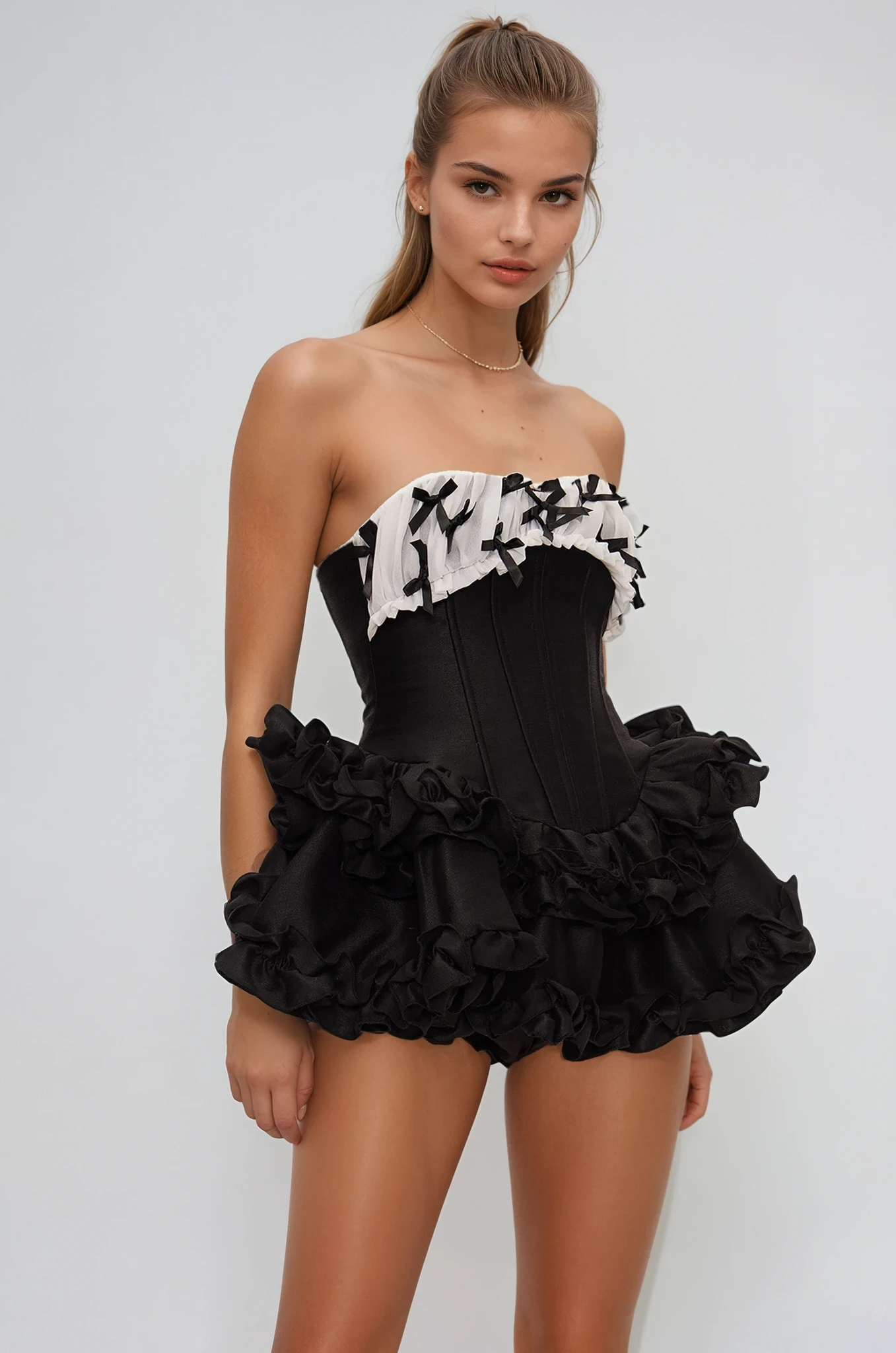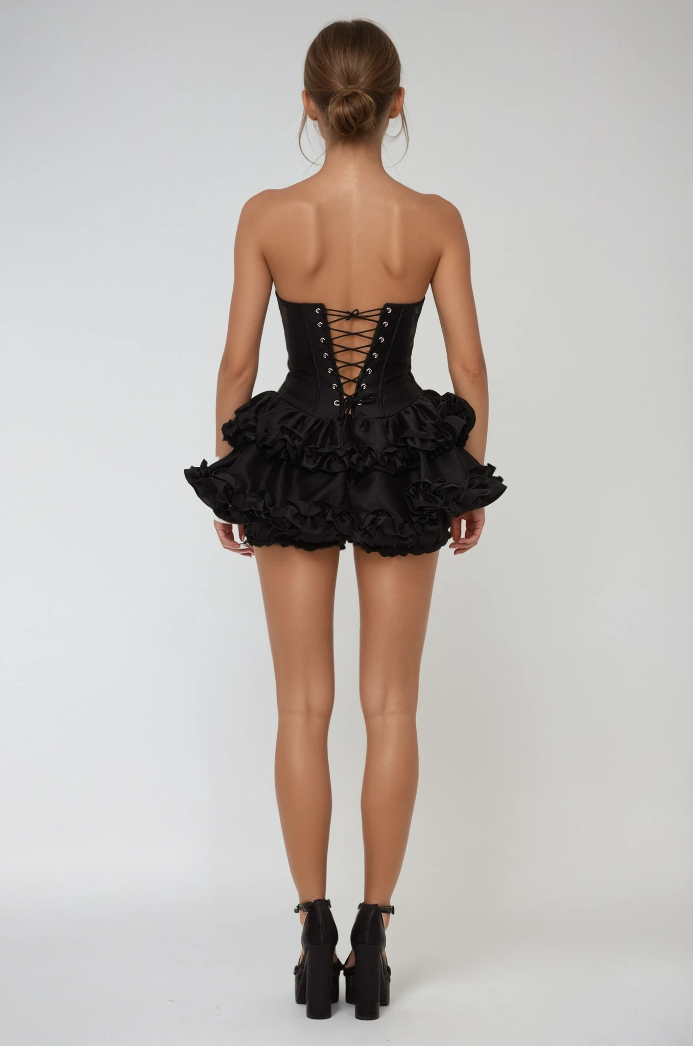 The Daxton Strapless Corset Puffy Mini Dress in Black combines structured elegance with contemporary silhouette. This piece features a fitted corset bodice that provides support and definition, paired with voluminous puffed skirt for dramatic movement and visual impact. The strapless neckline creates a sophisticated, versatile look suitable for evening events, parties, or statement occasions. Crafted for those seeking bold, fashion-forward pieces that balance architectural tailoring with romantic volume. Perfect for making an unforgettable entrance.