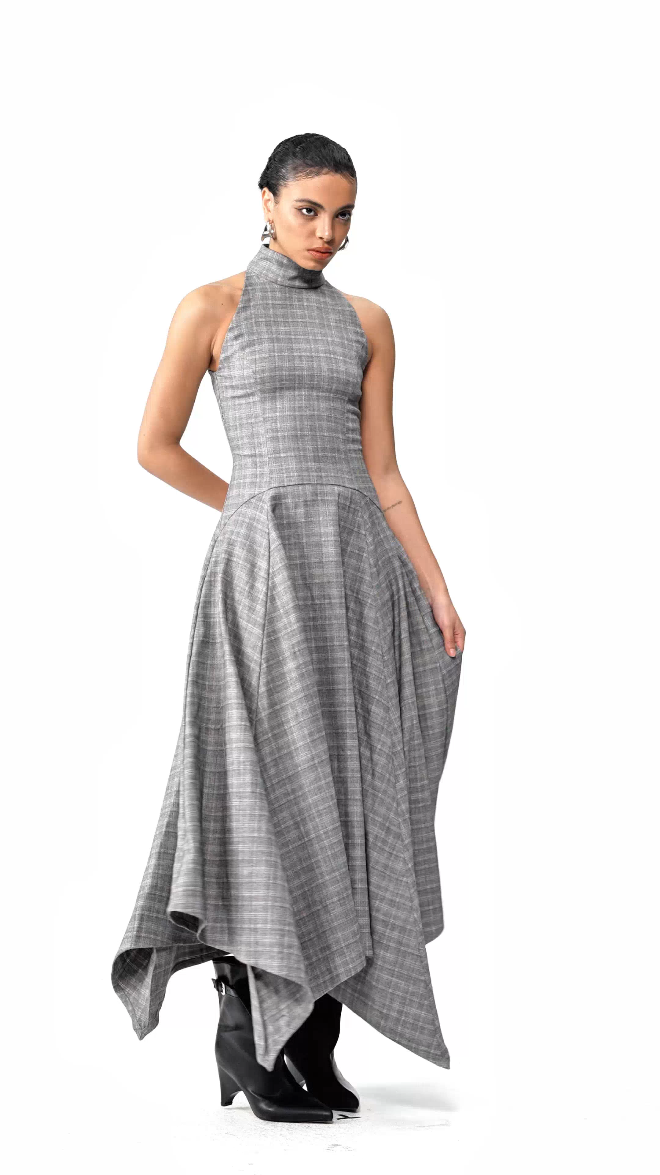 The Deneb High Neck Grid Maxi Dress combines sophisticated tailoring with modern design. Its high neckline and clean grid pattern offer a refined silhouette, while the maxi length enhances elegance and versatility. Crafted for a polished look, this dress is ideal for professional settings or upscale events, providing both comfort and style throughout your day.
