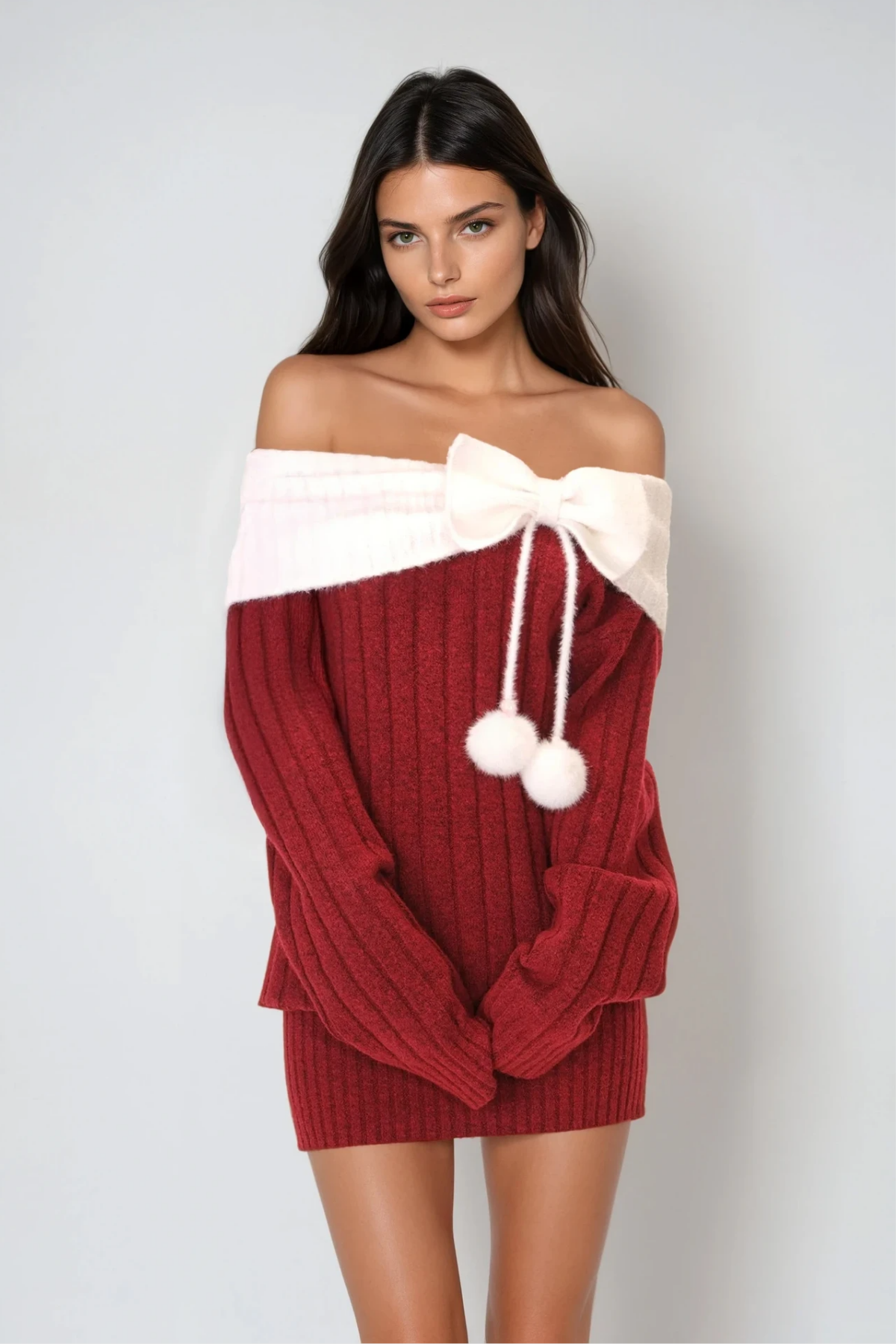 Devi Knit Off Shoulder Bow Mini Dress Crafted from premium knit fabric, this off-shoulder mini dress combines contemporary elegance with refined femininity. The signature bow detail at the neckline creates a sophisticated focal point, while the off-shoulder silhouette flatters the collarbone and shoulders. The fitted knit construction provides gentle shaping through the bodice, transitioning to a relaxed mini length that balances proportion and movement. Versatile enough for evening occasions or elevated casual wear, this piece pairs seamlessly with heels for formal events or sneakers for a modern, laid-back aesthetic. An essential addition to any wardrobe seeking polished, statement-making pieces.