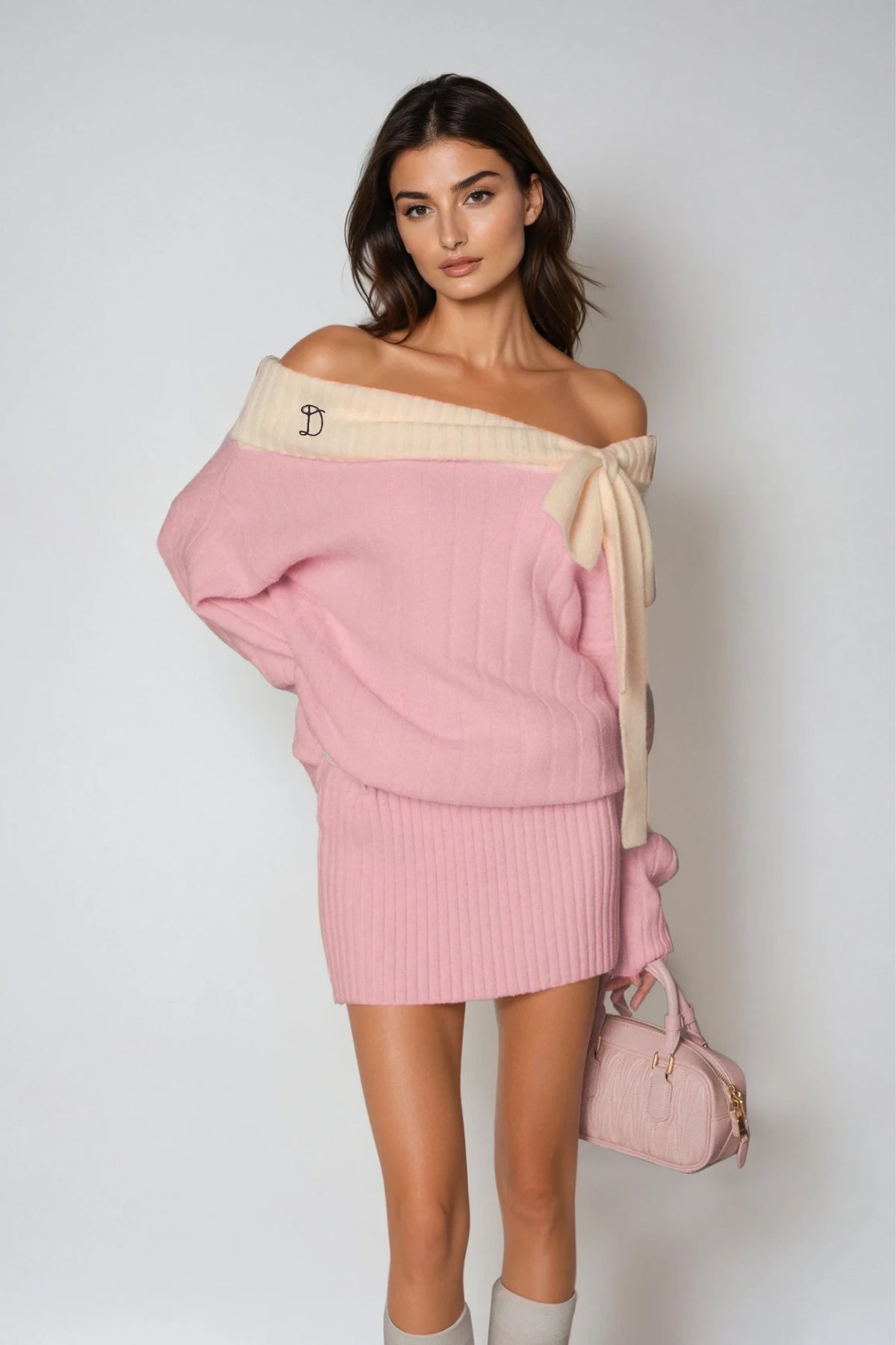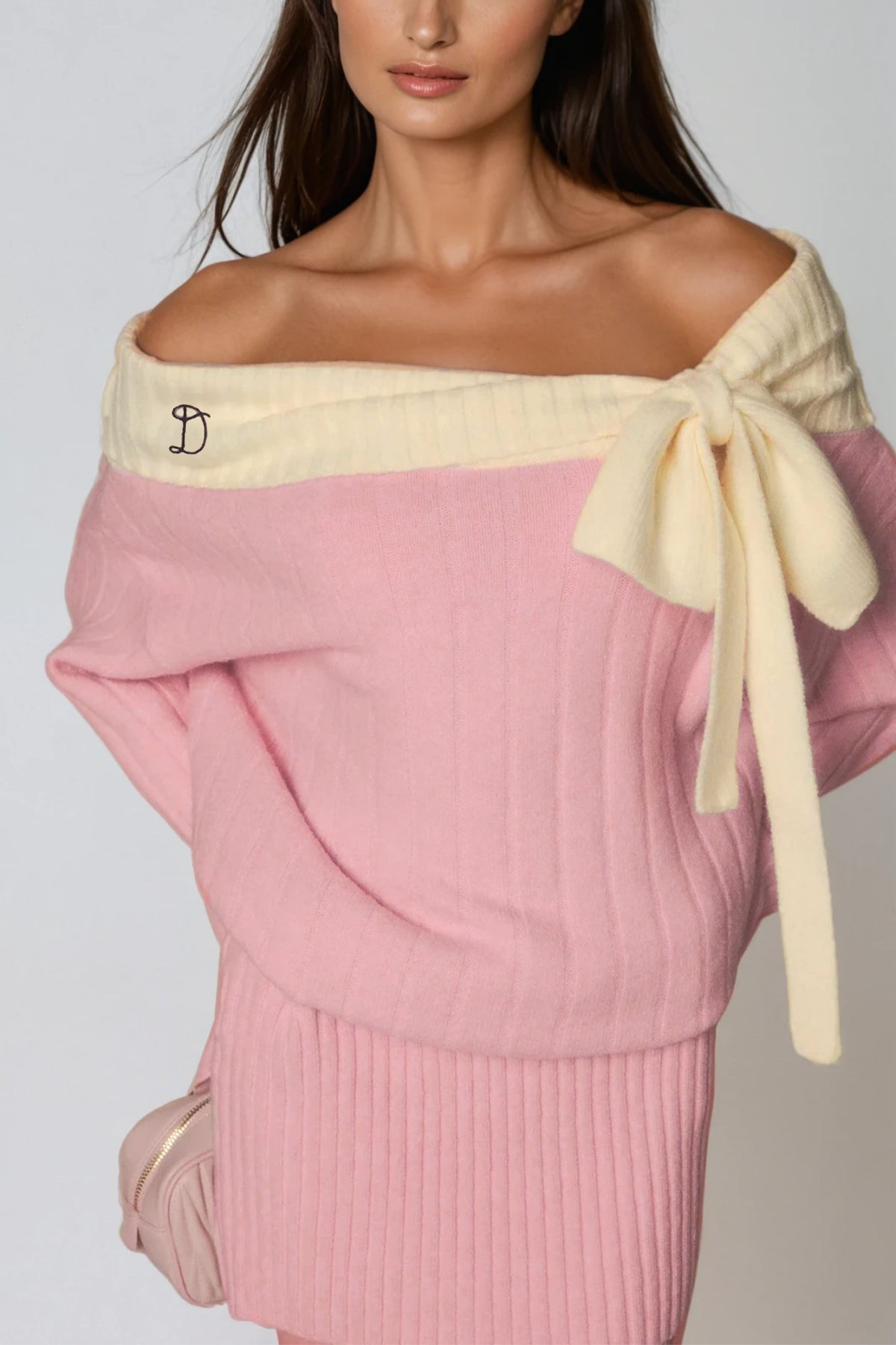 Elevate your wardrobe with this sophisticated off-shoulder bow knit mini dress in blush pink. The delicate bow detail at the neckline adds a refined touch, while the fitted knit construction offers both comfort and a flattering silhouette. Perfect for transitional seasons, this piece works seamlessly from casual daytime outings to evening occasions. The mini length showcases the legs while maintaining an elegant aesthetic. Pair with heels or ankle boots to complete the look.