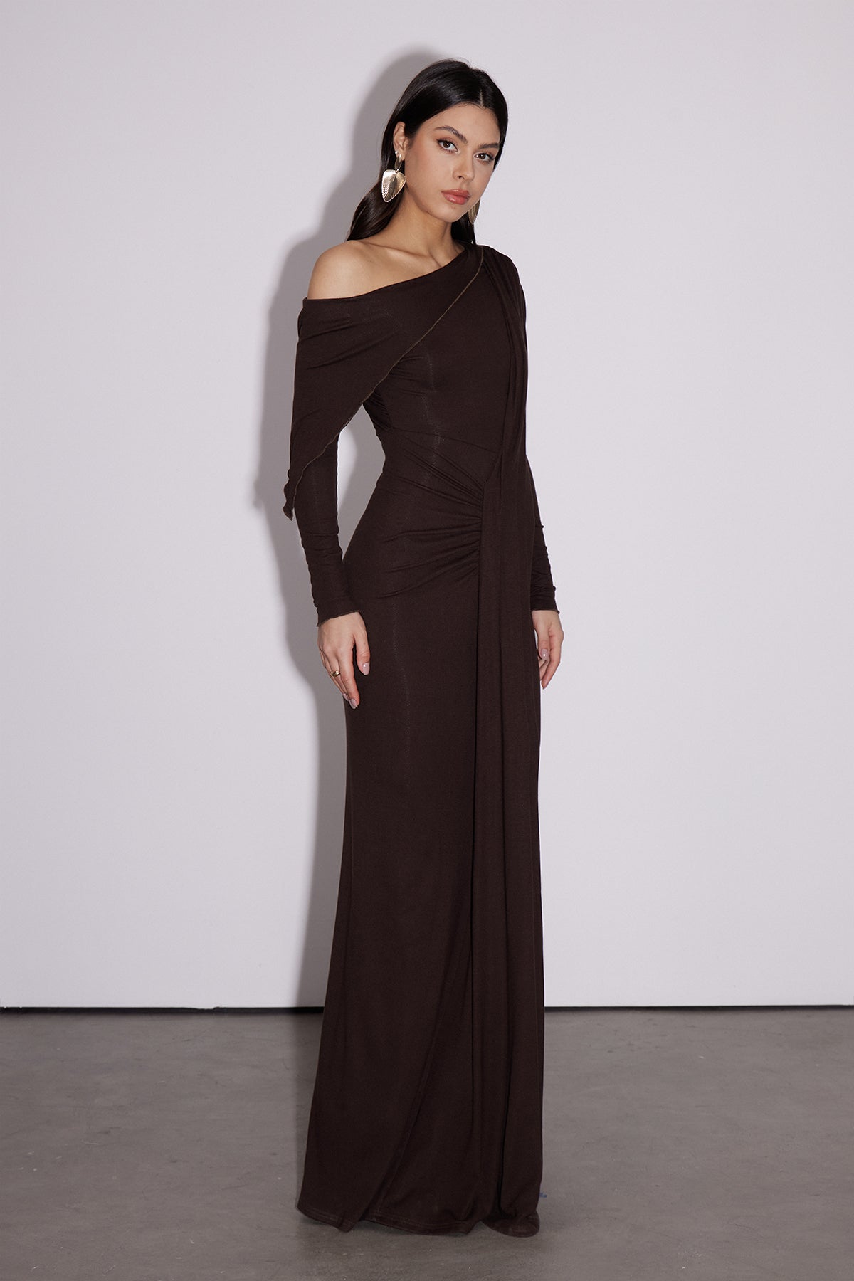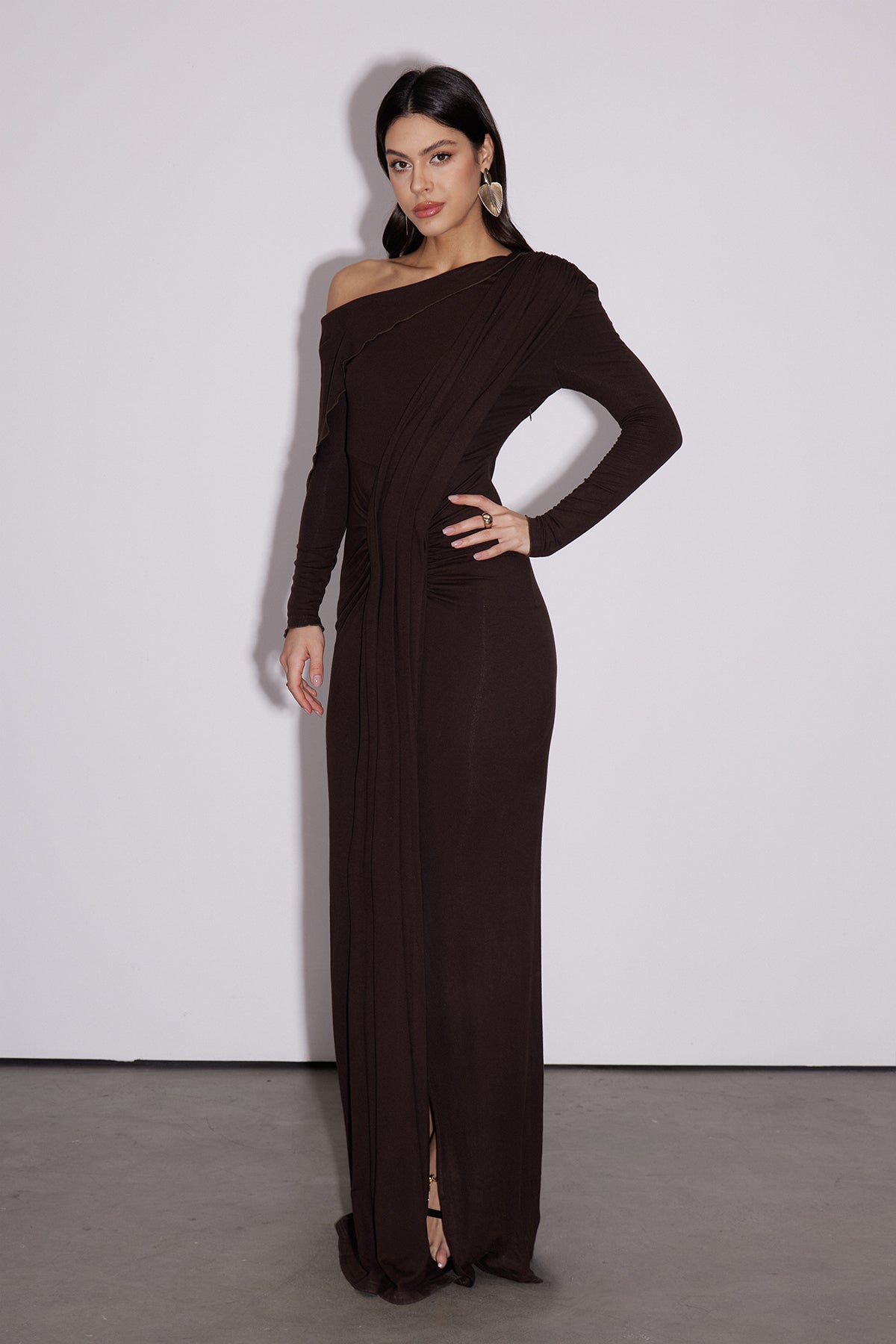 The Dhruv One Shoulder Ruch Split Maxi Dress combines architectural elegance with contemporary silhouette. The asymmetrical one-shoulder neckline creates a striking focal point, while strategic ruching defines the torso with dimension and movement. A thigh-high split adds versatility—wear it for evening sophistication or dress it down for refined daytime occasions. The maxi length provides coverage with undeniable drama. Crafted for those who appreciate statement pieces that balance structure with fluidity, this dress transitions seamlessly from special events to upscale casual settings.