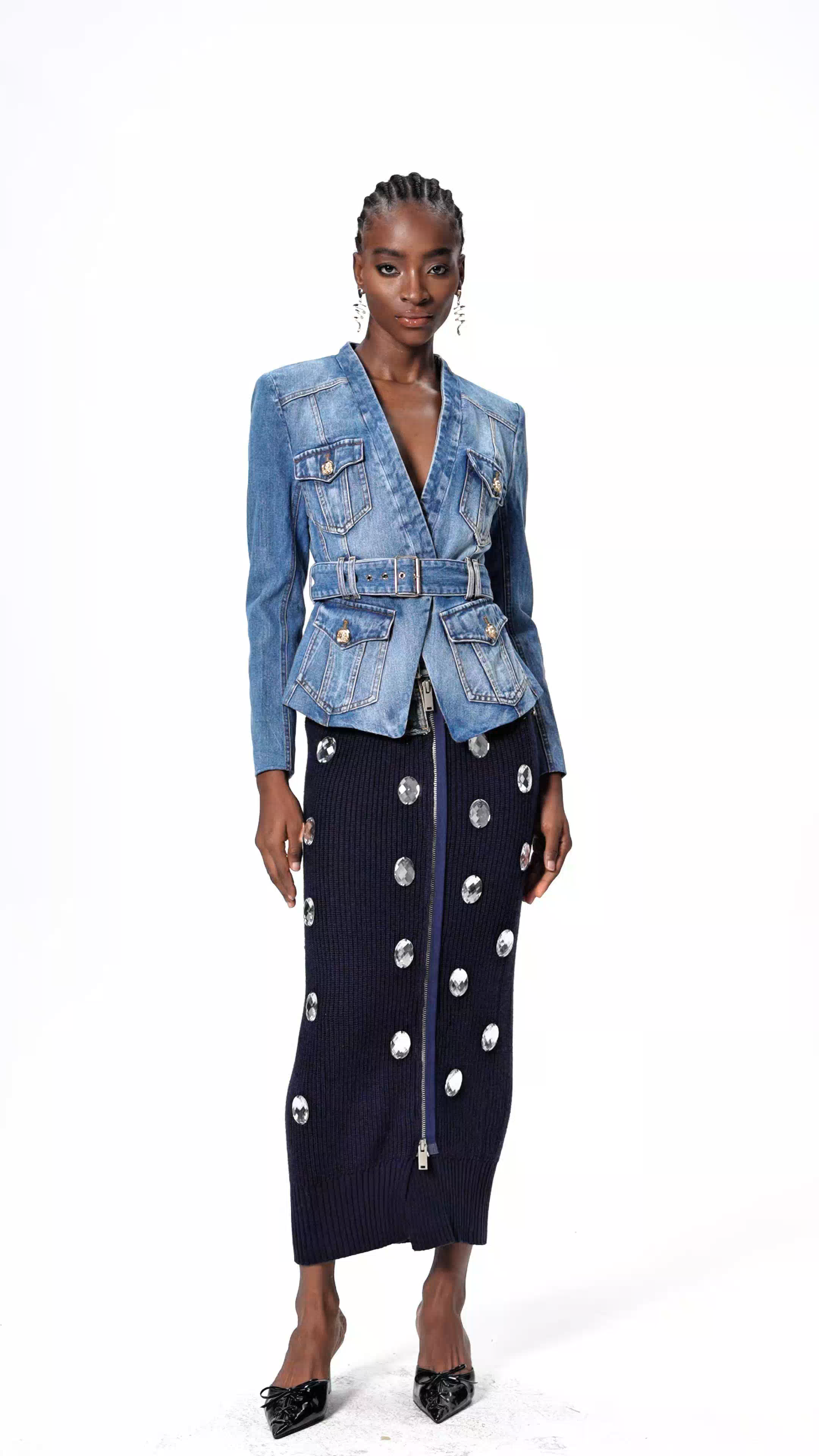 The Dionysia Plunge Denim Jacket redefines classic denim with a sophisticated plunge neckline that commands attention. Crafted from premium denim, this jacket seamlessly transitions from casual to elevated styling, offering versatility for any occasion. The plunging front creates a striking silhouette while maintaining the timeless durability denim is known for. Perfect for layering or wearing as a statement piece, this jacket combines contemporary design with enduring quality. An essential addition to any discerning wardrobe.