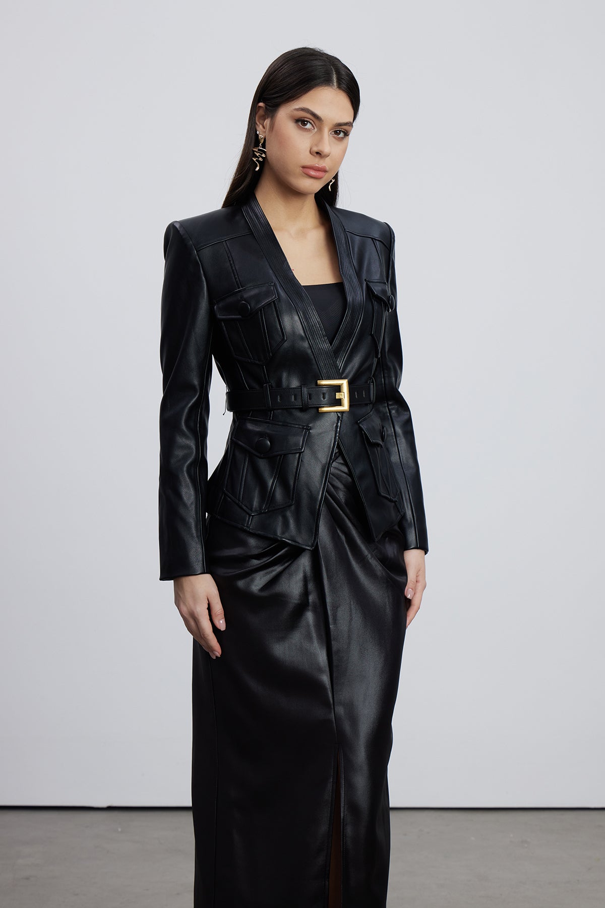 The Dionysia Plunge Leather Jacket combines timeless sophistication with contemporary edge. Crafted from premium leather, this statement piece features a dramatic plunge neckline that commands attention while maintaining refined elegance. The tailored silhouette flatters the figure, while quality construction ensures durability and longevity. Perfect for elevating evening wear or adding an upscale touch to casual styling, this jacket transitions seamlessly from day to night. An investment piece that transcends seasonal trends, the Dionysia delivers versatile styling potential for the discerning wardrobe.