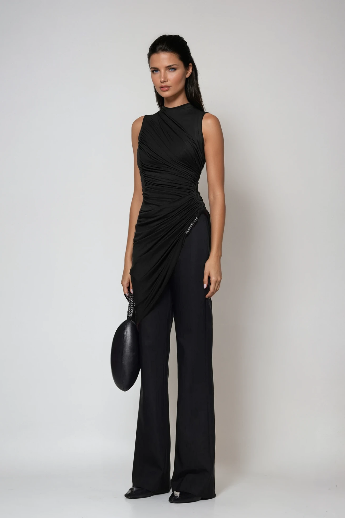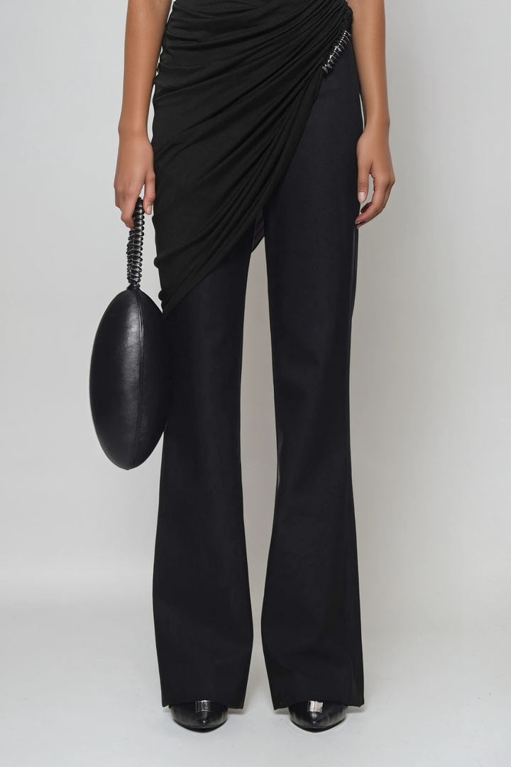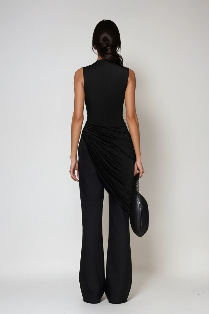 Sculpted silhouette meets modern edge with the Dirce Ruch Bodycon Asymmetric Pants Set. This striking two-piece features strategically placed ruching that contours the body while the asymmetric cut delivers an avant-garde aesthetic. The bodycon fit emphasizes your natural curves, while the coordinated set design ensures effortless styling. Crafted in classic black, this piece transitions seamlessly from evening events to upscale casual occasions. Perfect for those who command attention through refined, architectural design.