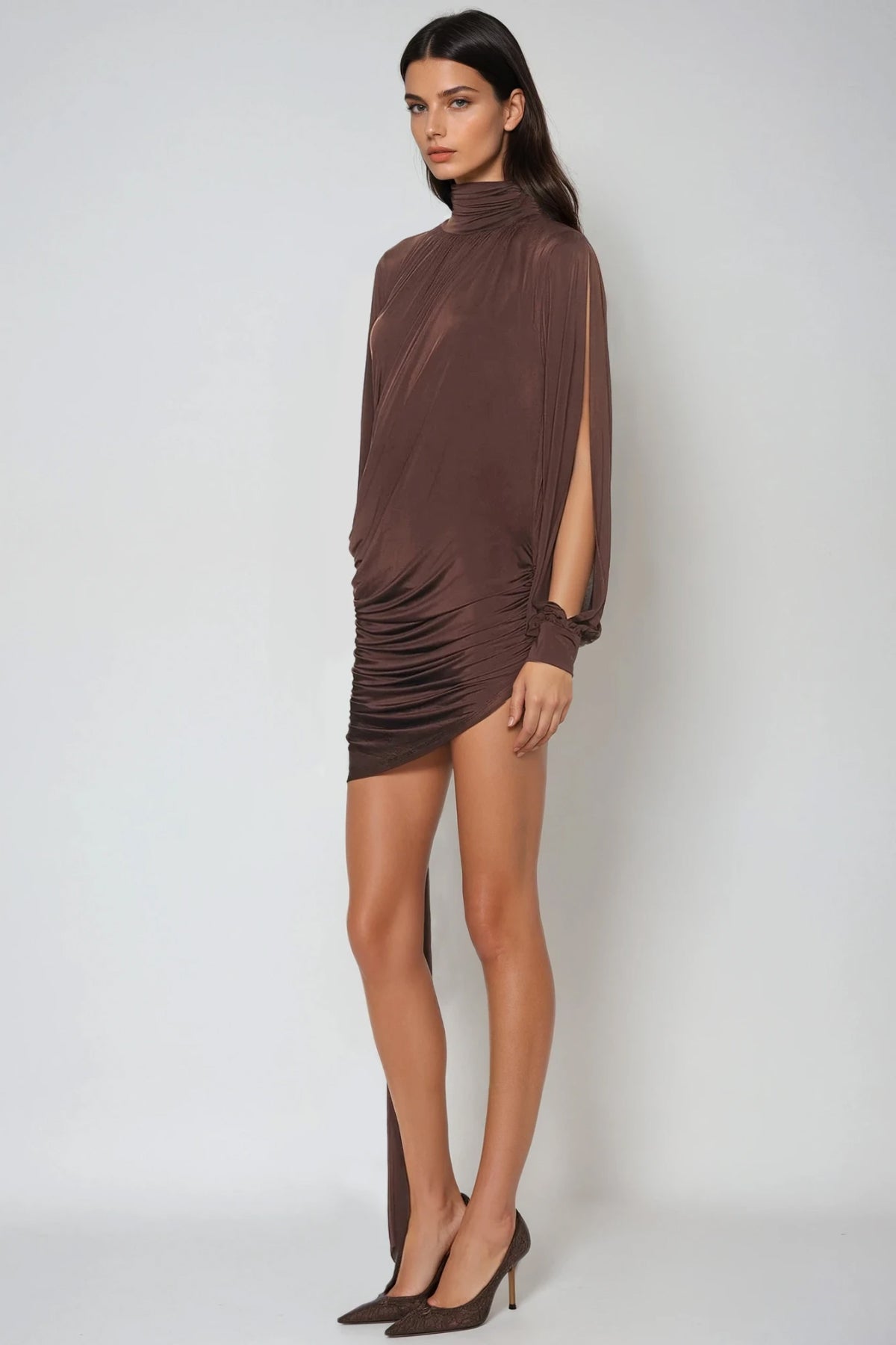 Domenica High Neck Ruch Fringe Mini Dress