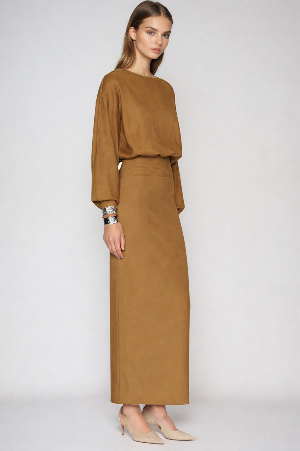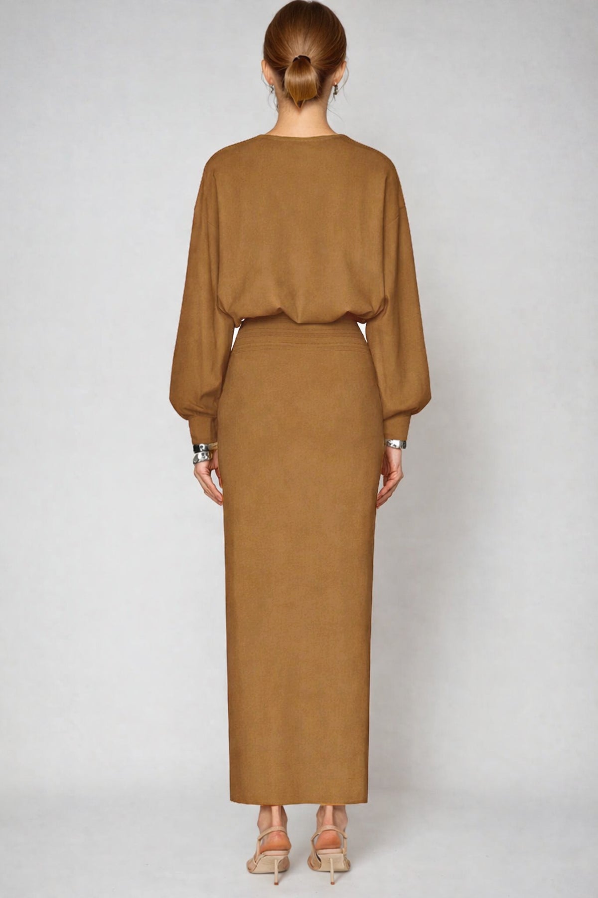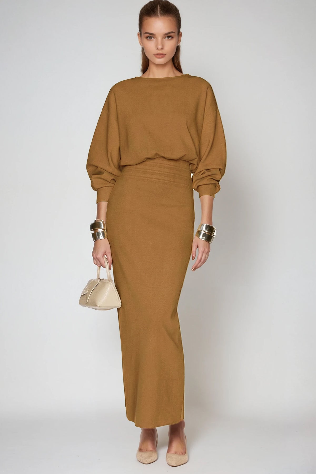 The Dominic Balloon Sleeve Bodycon Maxi Dress in Khaki combines contemporary silhouette design with timeless neutral elegance. Featuring voluminous balloon sleeves that create dramatic movement, this dress transitions seamlessly from day to evening wear. The fitted bodycon construction accentuates your natural curves while the floor-length maxi cut provides sophisticated coverage and graceful drape. Crafted in a versatile khaki tone, it pairs effortlessly with minimal accessories or layered pieces. Perfect for those seeking a statement piece that balances bold design details with understated color sophistication.