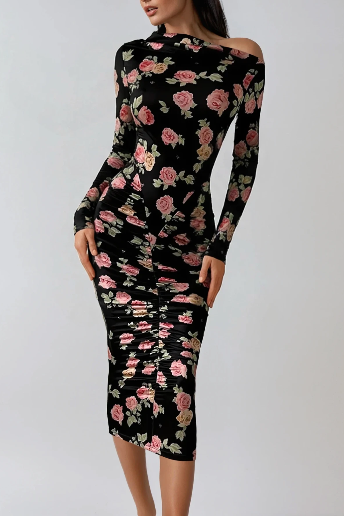 Dominiks Floral Bodycon Ruch Midi Dress In Black