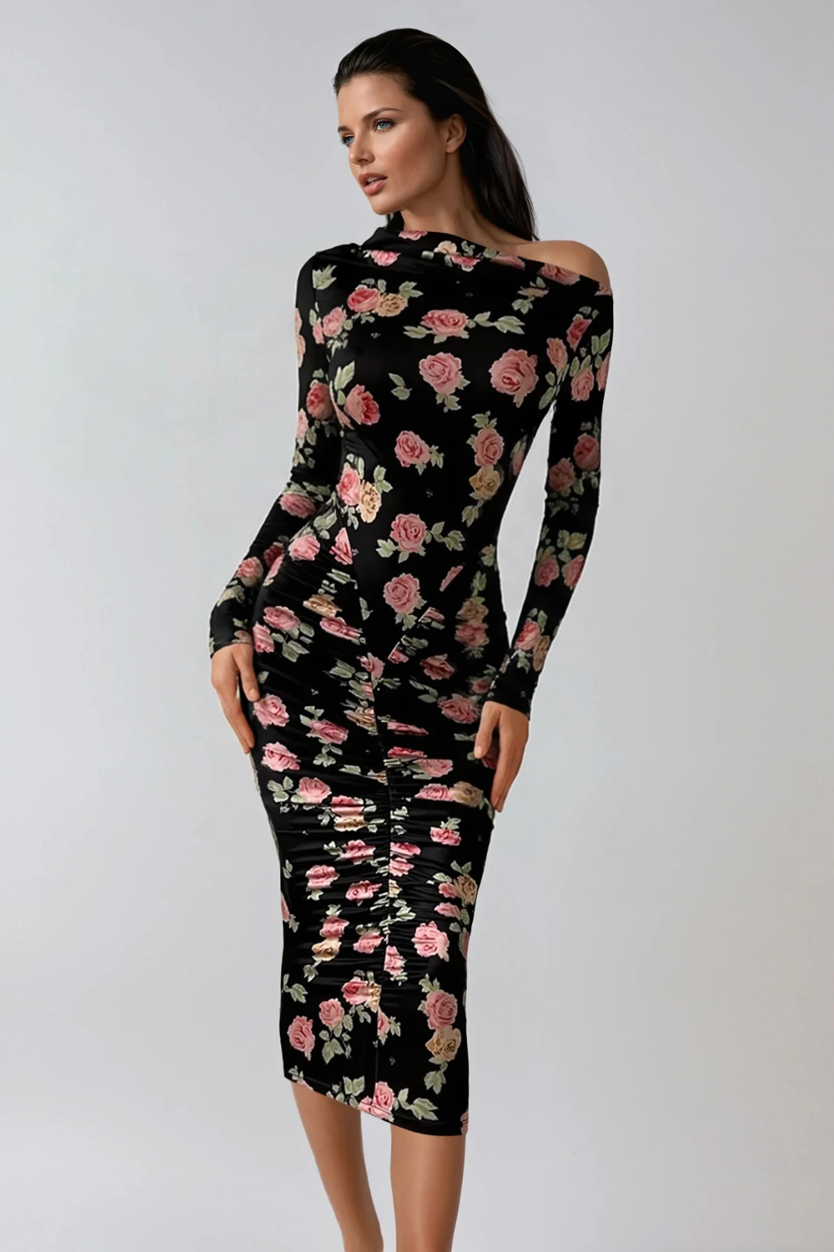 Dominiks Floral Bodycon Ruch Midi Dress In Black This sophisticated midi dress combines architectural tailoring with refined elegance. The bodycon silhouette hugs your curves while strategic ruching creates dimension and visual interest throughout. Delicate floral detailing adds a subtle romantic element against the classic black base, making it versatile enough for evening events or upscale casual occasions. The midi length offers modern coverage without sacrificing style, while the structured fit ensures a polished, put-together appearance. Perfect for those seeking a dress that balances contemporary design with timeless appeal.