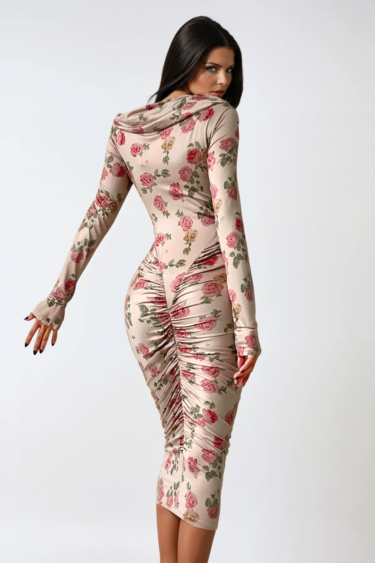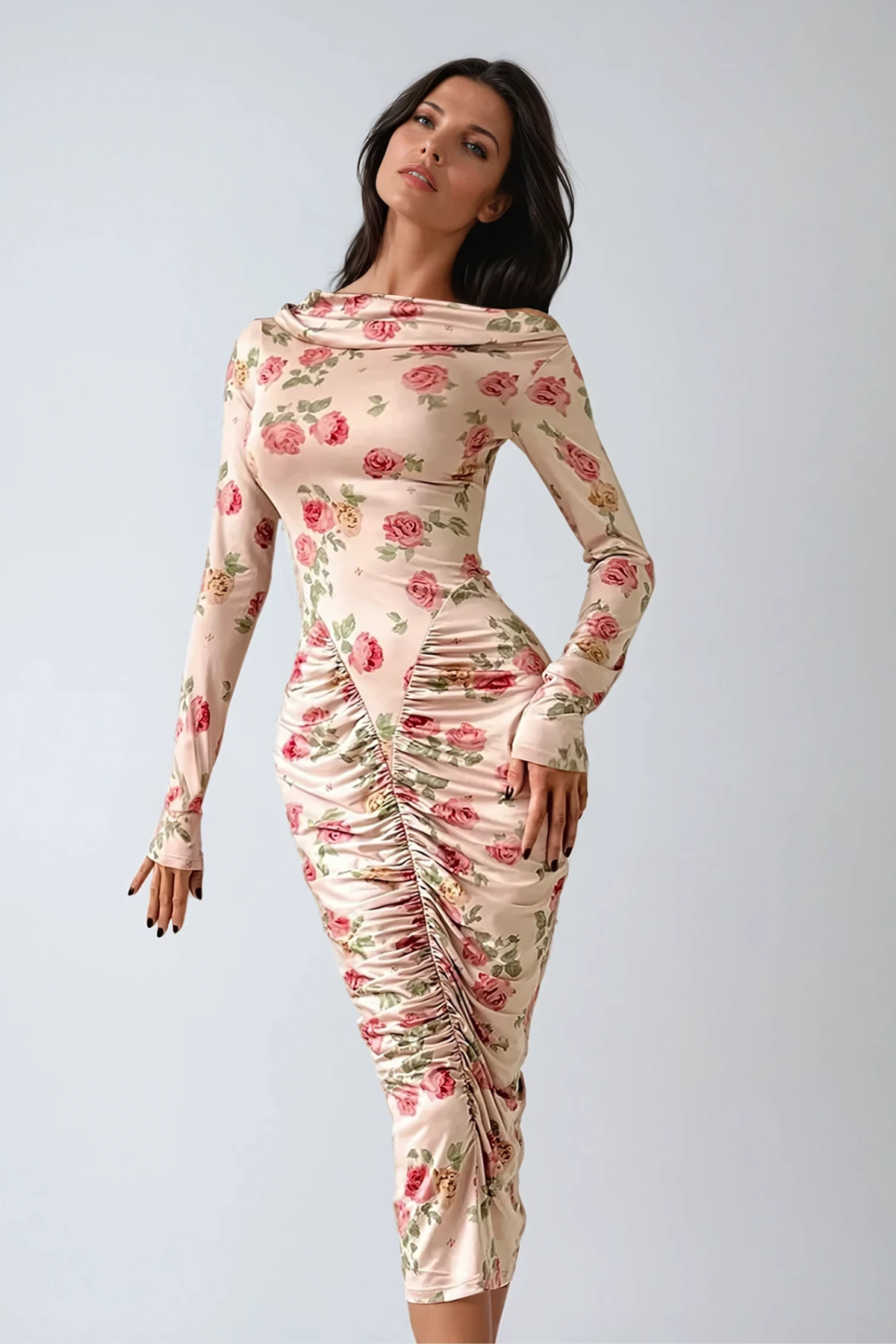 Dominiks Floral Bodycon Ruch Midi Dress In Pink This sophisticated midi dress combines flattering silhouette engineering with refined aesthetic appeal. The bodycon construction accentuates your natural curves while the strategic ruching detail creates dimension and visual interest. Rendered in a delicate floral print against a soft pink base, the design transitions seamlessly from daytime occasions to evening events. The midi length offers versatile styling options—pair with heels for polished elegance or minimalist sneakers for contemporary ease. Premium fabric construction ensures comfortable wear throughout the day, while the thoughtful design details demonstrate quality craftsmanship. An essential piece for those seeking both style and wearability in their wardrobe.