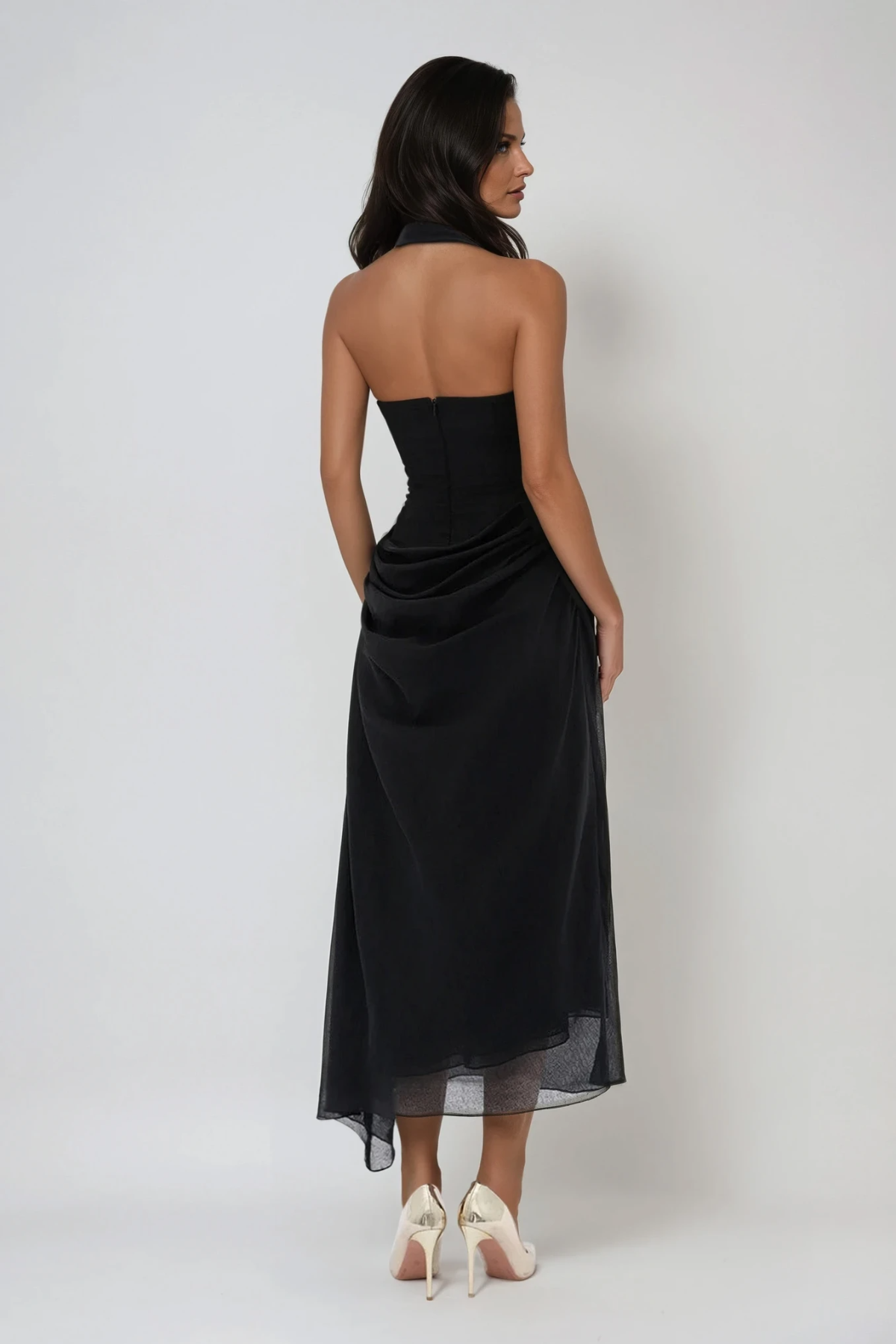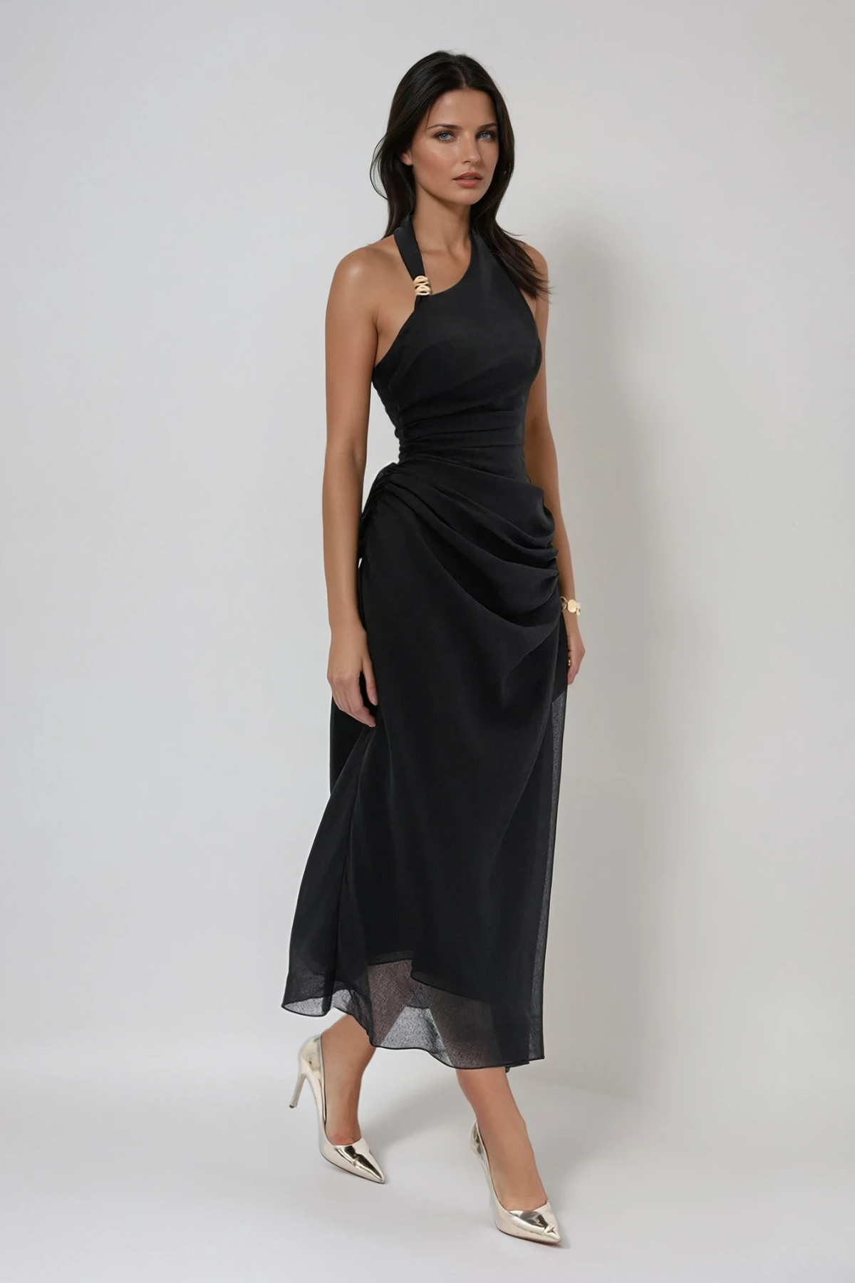Domitila Halter Neck Asymmetric Maxi Dress This striking maxi dress combines architectural design with refined elegance. The halter neckline provides secure support while creating a flattering frame for the shoulders, while the asymmetric hemline adds contemporary sophistication and movement. Crafted for versatility, this piece transitions seamlessly from evening events to upscale casual occasions. The flowing silhouette skims the body gracefully, offering both comfort and a polished appearance. An investment piece that commands attention through understated design excellence.