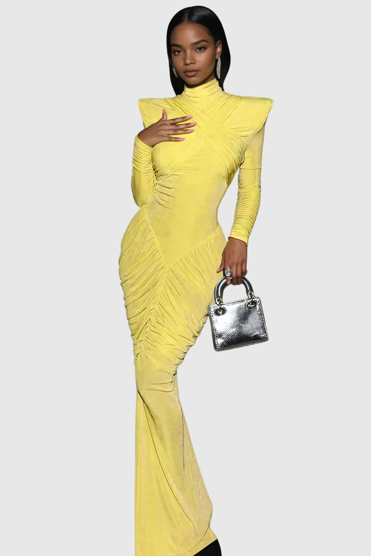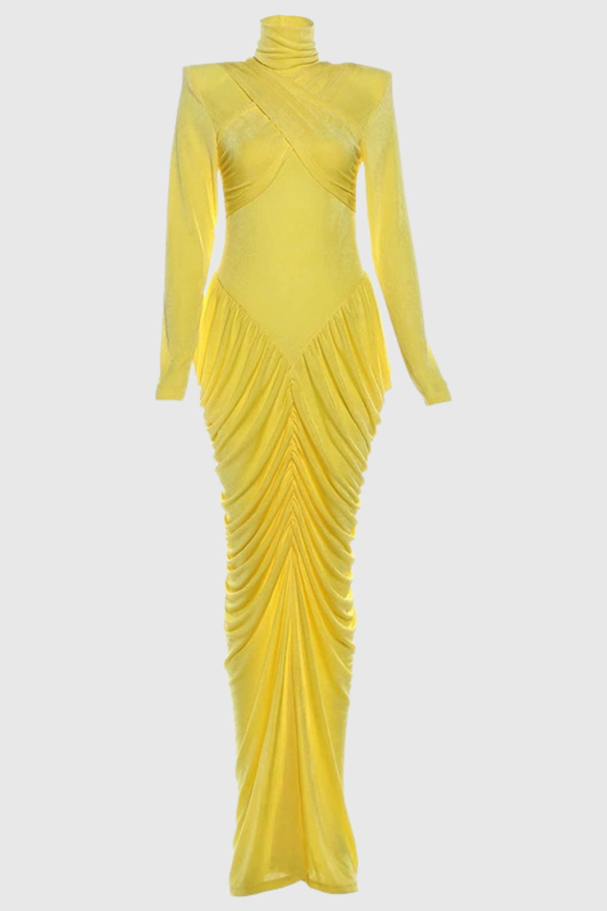 The Donata Backless Ruch Bodycon Maxi Dress in Yellow combines contemporary silhouette design with timeless elegance. This floor-length piece features a form-fitting bodycon construction that accentuates your natural curves, while strategic ruching adds dimension and visual interest. The daring backless design creates a sophisticated statement, perfect for evening events or upscale occasions. Crafted for a polished appearance, this yellow maxi dress transitions seamlessly from cocktail parties to formal gatherings. The combination of bold styling and refined tailoring makes it an essential addition to any fashion-forward wardrobe.