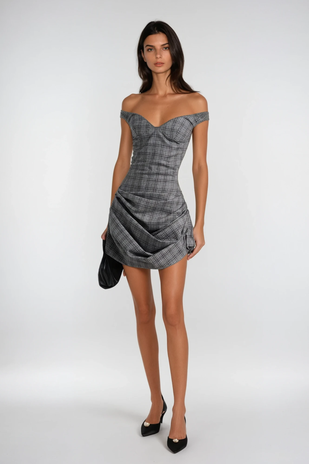 The Doreen Off Shoulder Grid Mini Dress combines contemporary design with versatile styling. This piece features a flattering off-shoulder neckline that creates an elegant silhouette, while the grid pattern adds visual interest and texture. The mini length offers a modern, youthful aesthetic perfect for casual outings or elevated evening occasions. The off-shoulder cut provides a sophisticated touch that works seamlessly from day to night, making it an essential addition to any wardrobe seeking refined, on-trend pieces.
