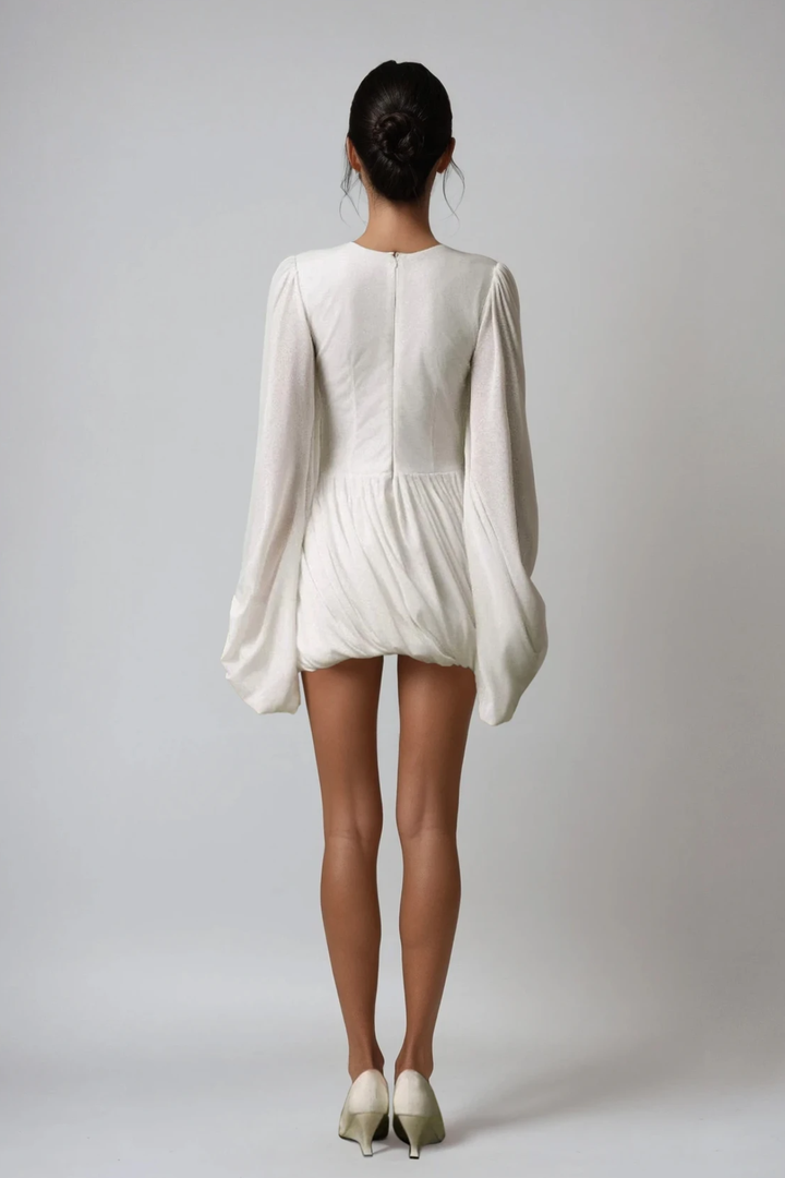 The Dorka Balloon Sleeve Ruch Mini Dress combines architectural silhouette with refined detailing. Voluminous balloon sleeves create a striking visual statement while the ruched bodice provides flattering dimension and subtle shaping. This mini dress balances dramatic sleeve proportions with a streamlined skirt, resulting in a sophisticated yet playful aesthetic. The ruching technique adds textural interest and movement, while the balloon sleeves introduce contemporary flair that distinguishes this piece from conventional options. Versatile enough for casual outings yet polished enough for special occasions, this dress showcases design expertise through thoughtful proportion and construction. Style with minimal accessories to allow the distinctive silhouette to command attention.