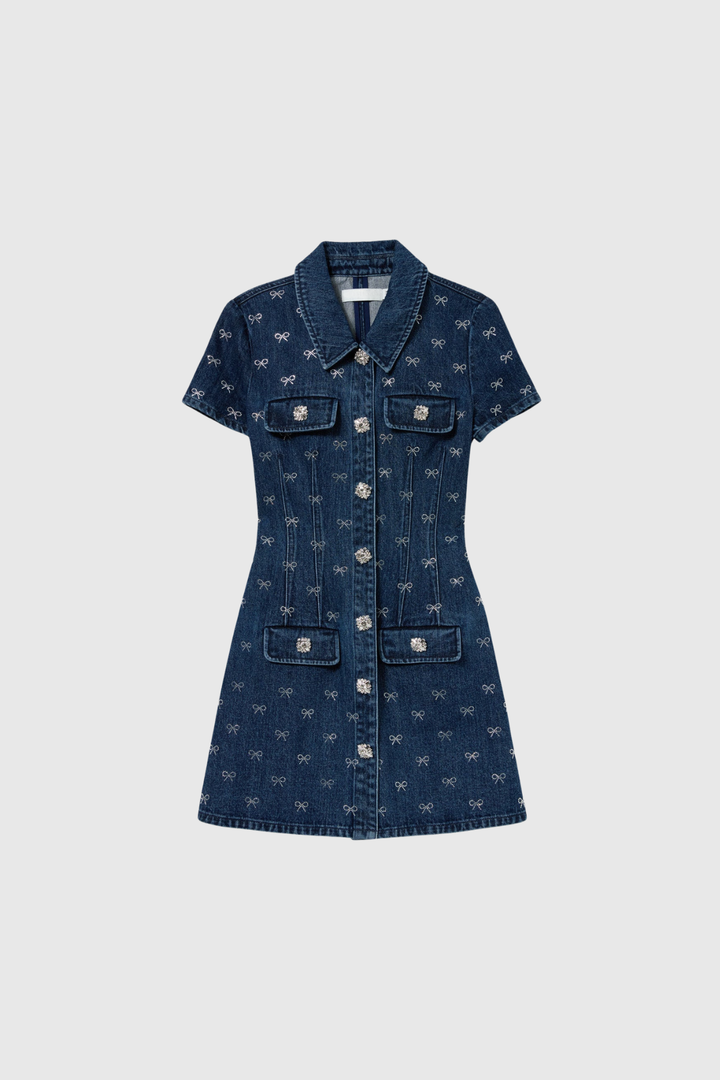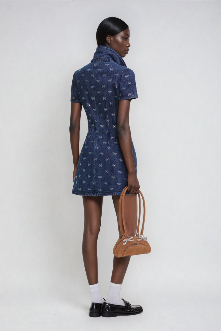The Dorotea Crystal Bow Denim Mini Dress reimagines casual denim through sophisticated embellishment and thoughtful design. A striking crystal bow detail transforms this mini dress into a statement piece that balances everyday wearability with special occasion appeal. The durable denim foundation ensures longevity and versatile styling options, while the crystalline bow accent introduces glamorous flair and visual sophistication. This hybrid piece works equally well styled casually with sneakers or elevated with heels, offering remarkable versatility across multiple occasions. The mini silhouette provides contemporary proportion and ease of wear, while the crystal detailing adds dimension and catches light beautifully. Ideal for those seeking investment pieces that deliver both polish and personality, this dress exemplifies expert craftsmanship through the seamless integration of embellishment and classic construction.