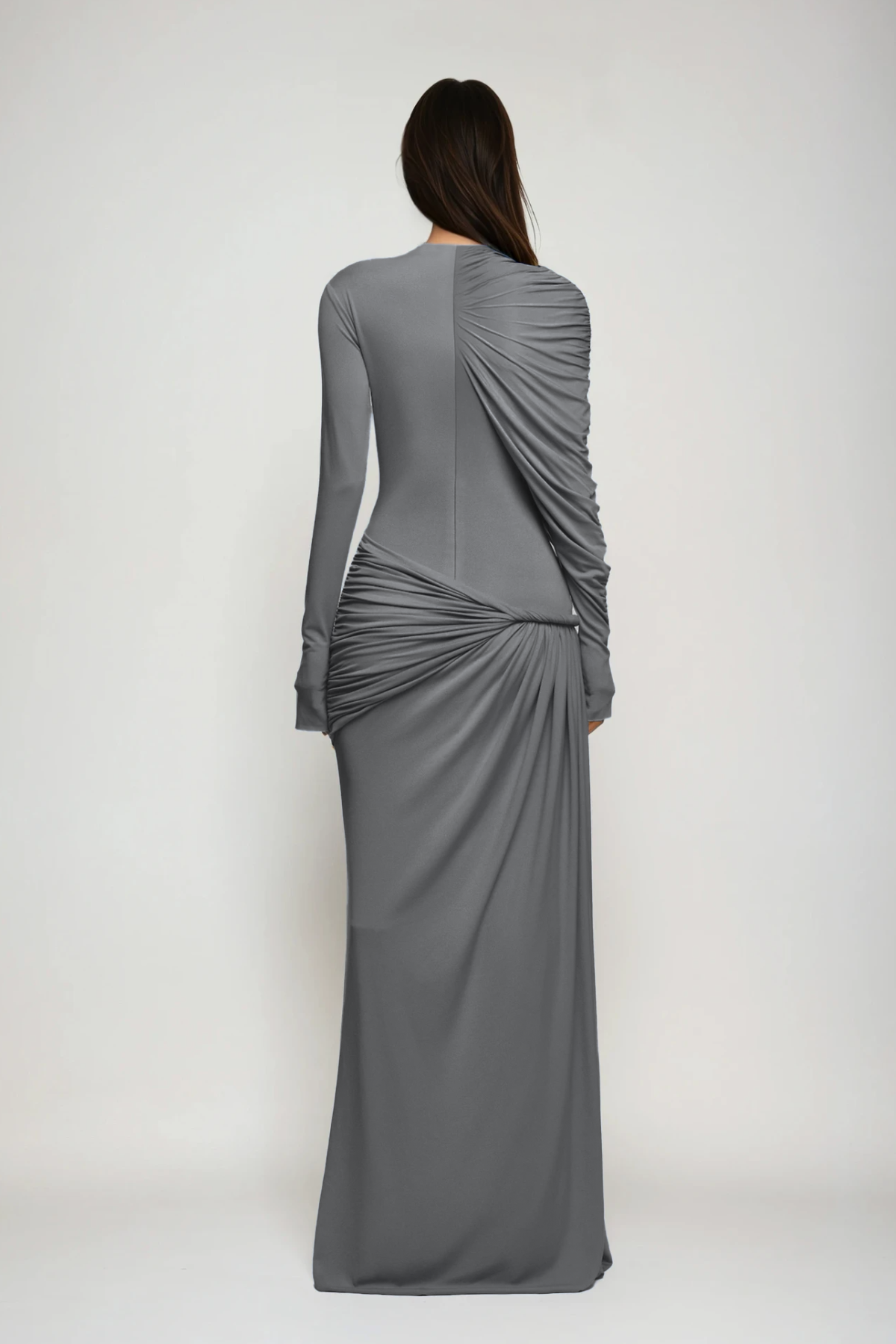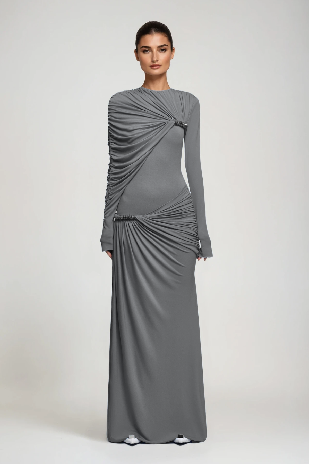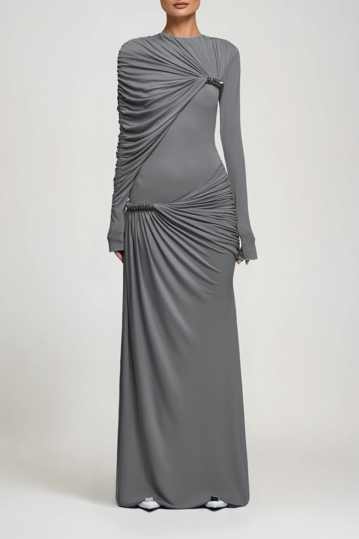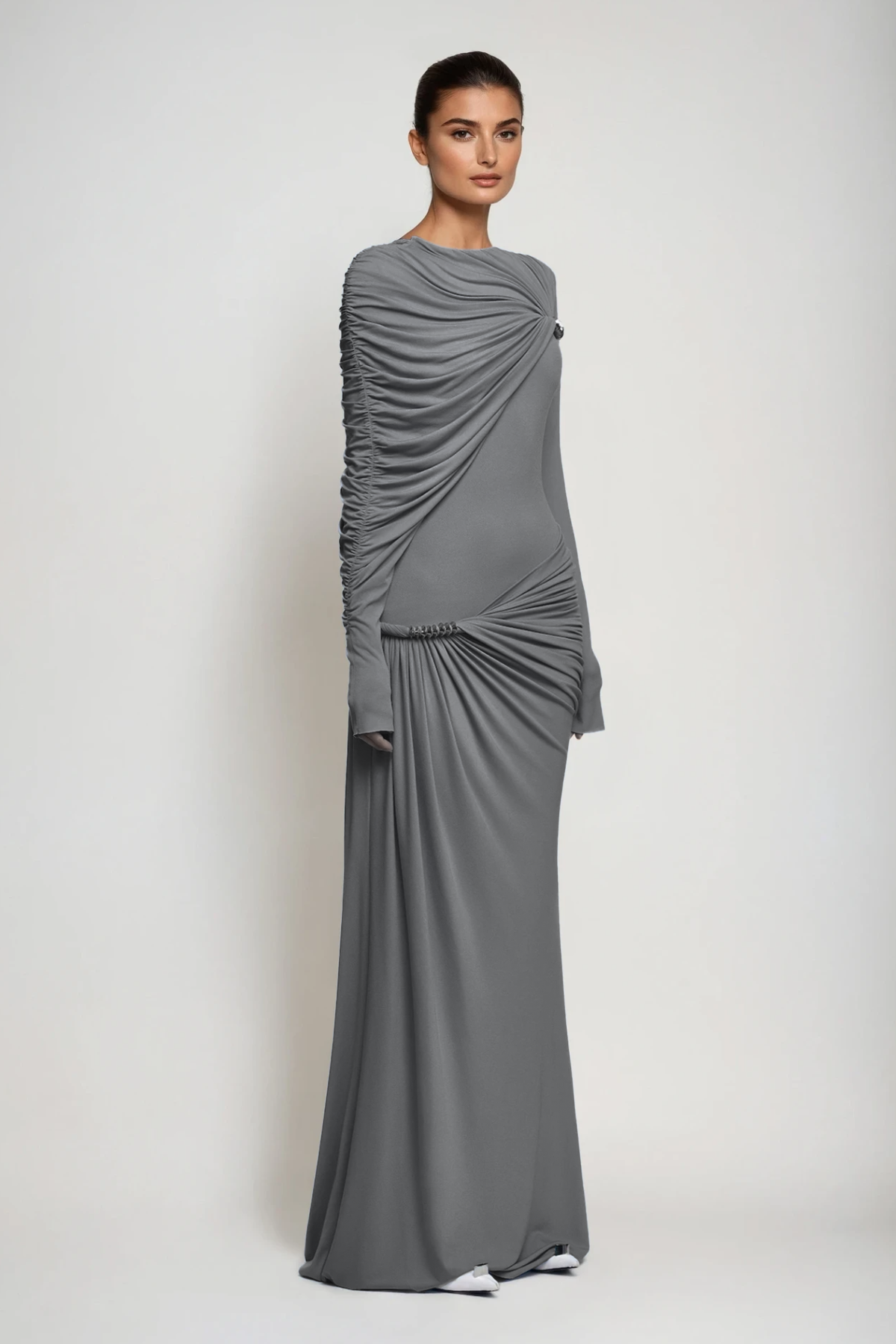 The Douglass Asymmetric Ruch Maxi Dress in Grey delivers understated elegance through its thoughtfully engineered design. The asymmetric ruching creates dimensional texture and visual interest while sculpting the body with precision. This versatile grey shade transitions seamlessly from formal events to sophisticated casual occasions. The flowing maxi silhouette pairs with the asymmetric cut to produce a modern aesthetic that avoids predictability. An investment piece for discerning customers who appreciate architectural tailoring and timeless appeal.