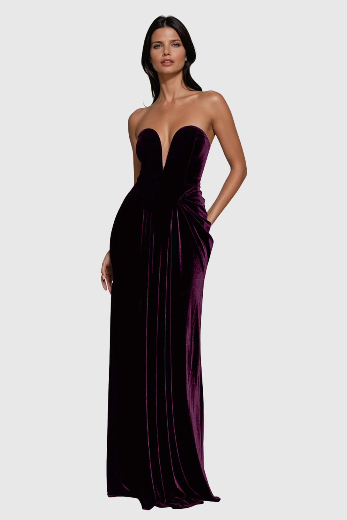 The Drina Strapless Draped Velvet Maxi Dress combines luxurious fabric with sophisticated silhouette. Crafted from sumptuous velvet, this strapless design features elegant draped detailing that creates fluid movement and refined dimension. The maxi length offers timeless elegance suitable for evening events, formal occasions, or upscale gatherings. The strapless neckline provides a modern, polished aesthetic while the draped construction ensures a flattering fit across various body types. Perfect for those seeking a statement piece that balances contemporary design with classic luxury.