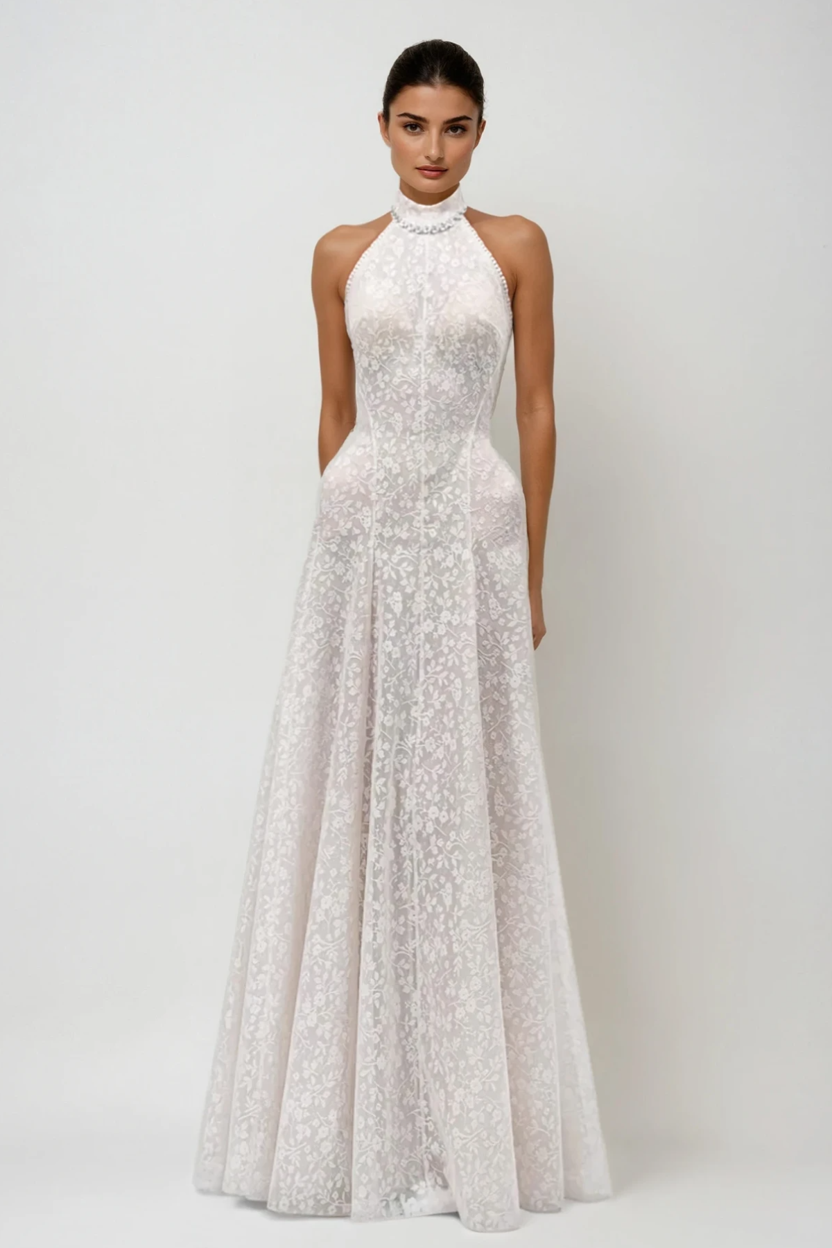 Du Halter Neck Floral Lace Maxi Dress Elevate your evening wardrobe with this sophisticated halter neck maxi dress, crafted from delicate floral lace that commands attention. The structured halter design provides confident support while the flowing maxi silhouette creates an elegant, elongated line. Intricate lace detailing adds refined texture and dimension, making this piece ideal for formal events, upscale gatherings, or special occasions. The timeless floral pattern ensures versatility across seasons, while the floor-length cut delivers a polished, statement-making aesthetic. Perfect for those seeking a dress that balances femininity with understated luxury.