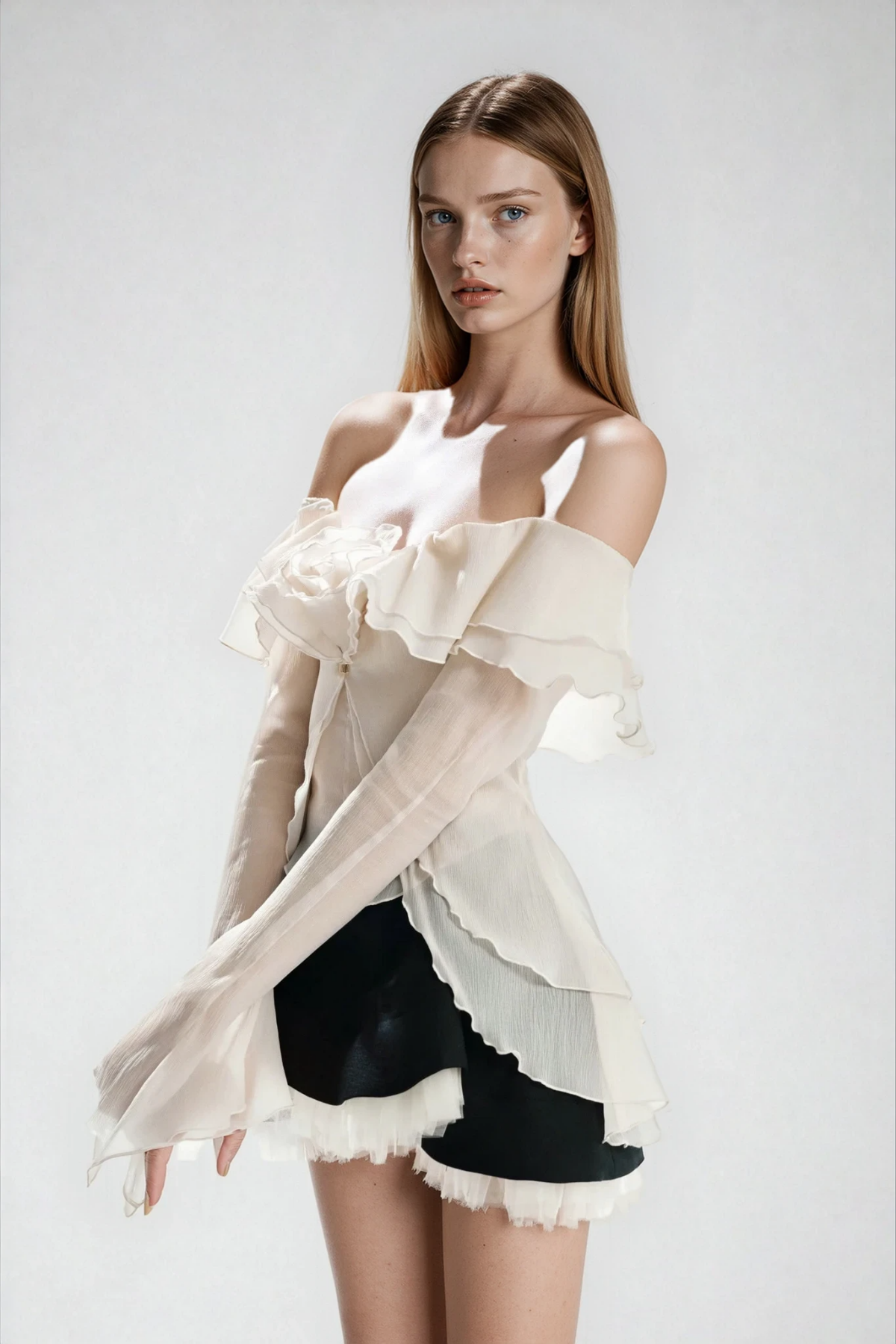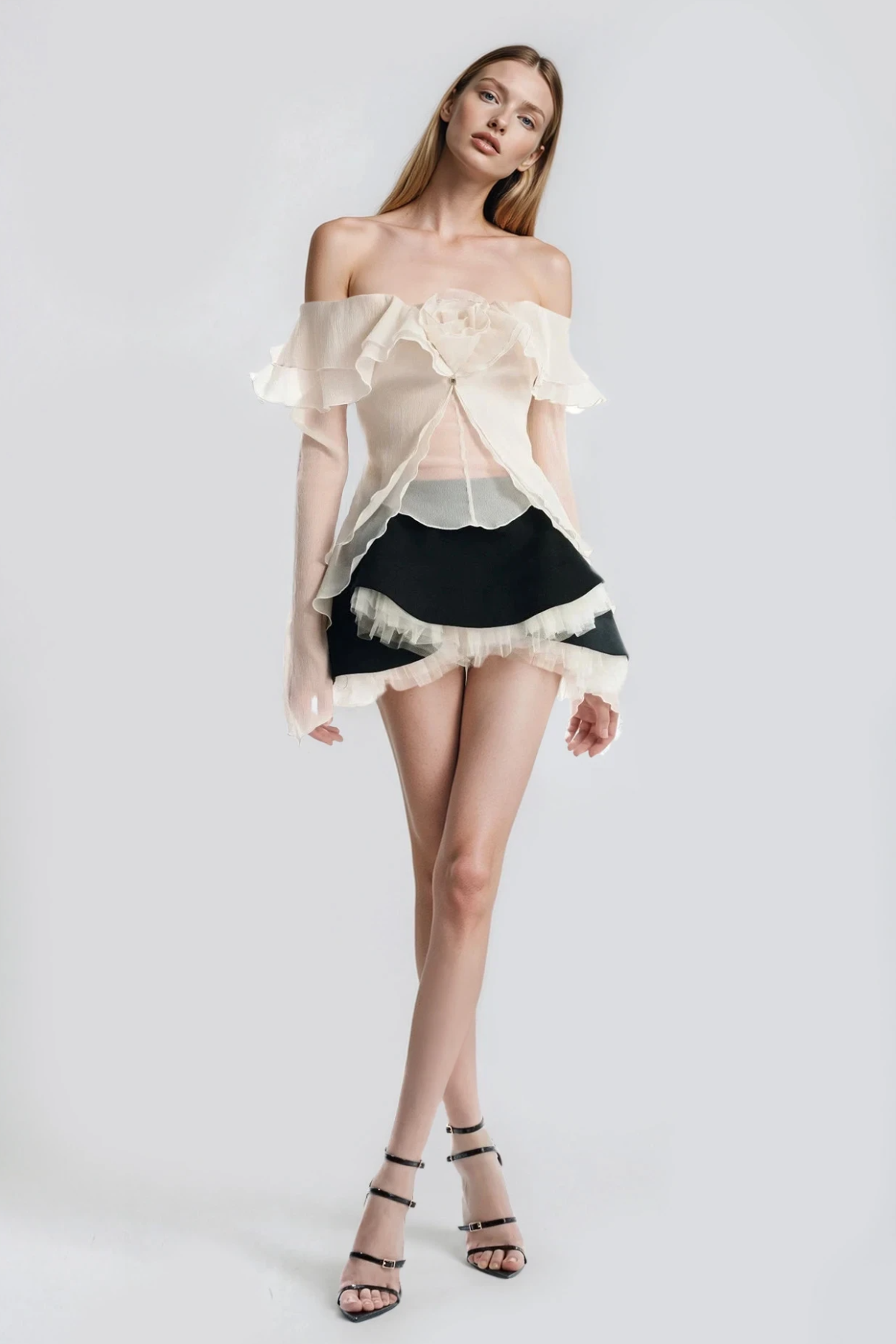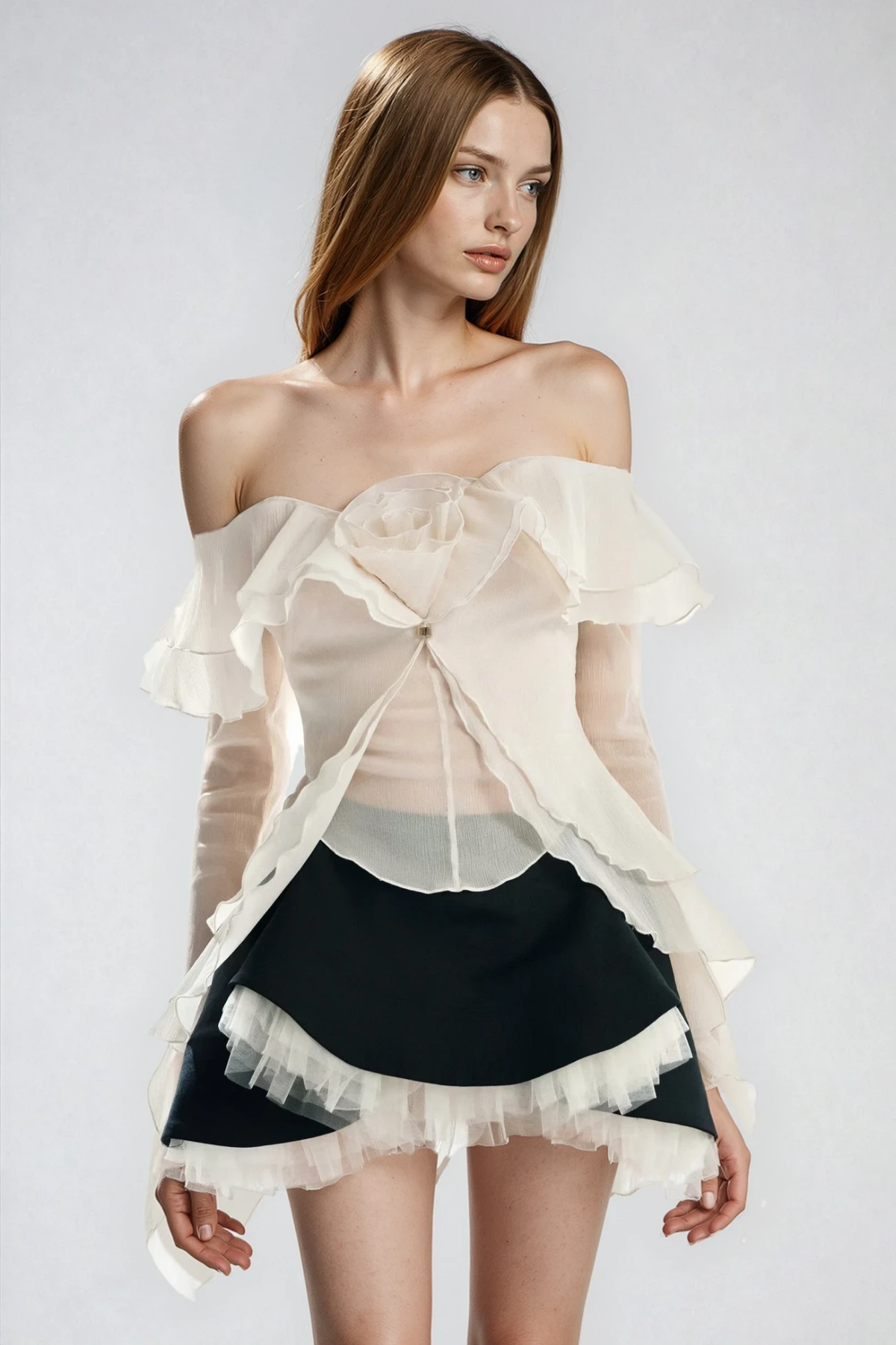 Elevate your wardrobe with this sophisticated off-shoulder ensemble featuring delicate floral detailing and cascading ruffles. The coordinated skirt set combines feminine elegance with contemporary styling, offering versatile layering for both casual and refined occasions. Crafted with attention to detail, the off-shoulder neckline creates a flattering silhouette while the textured ruffle elements add dimension and movement. Perfect for those seeking a polished look that transitions seamlessly from day to evening wear.