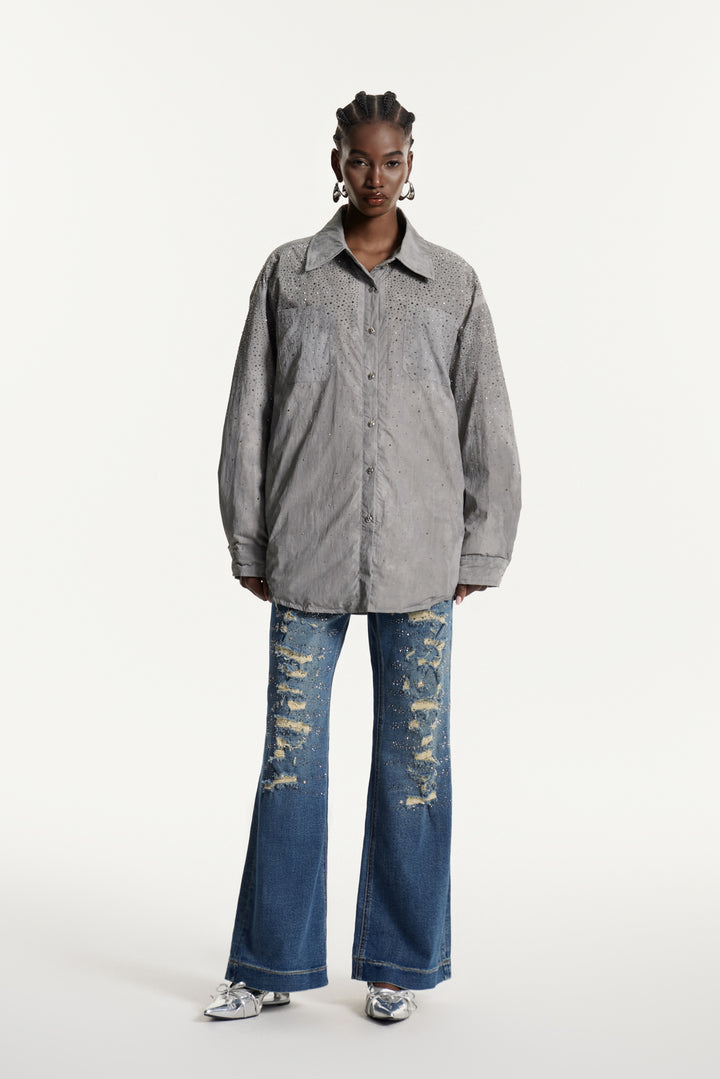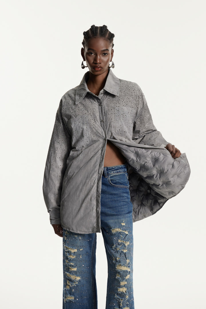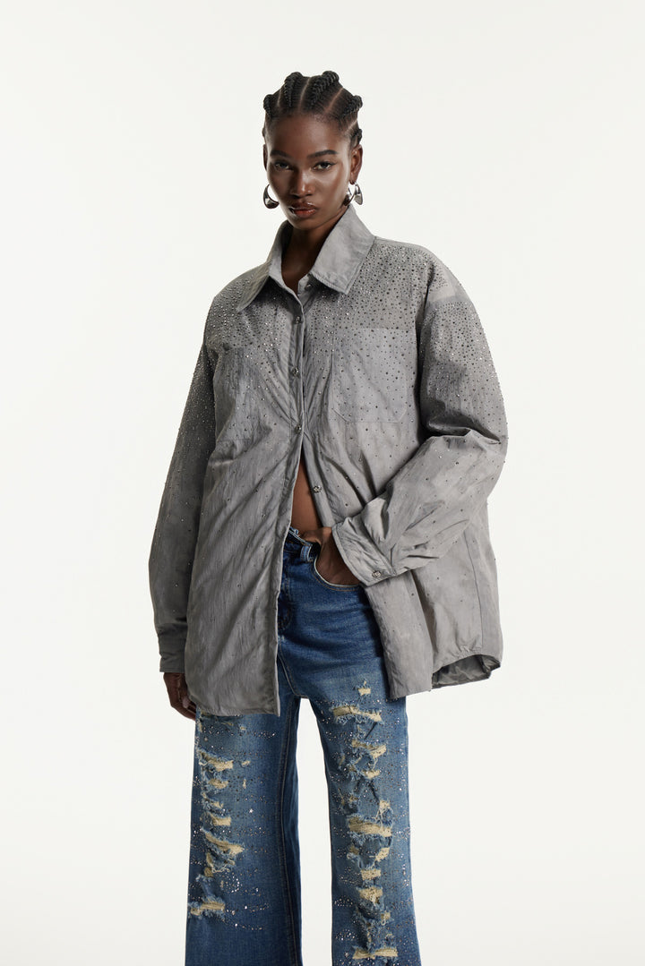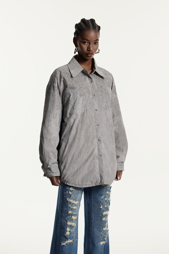 The Edytha Rhinestone Shirt combines contemporary design with refined craftsmanship. Featuring strategically placed rhinestone embellishments that catch light beautifully, this piece elevates any wardrobe with understated glamour. Crafted from quality fabric, it offers both comfort and durability for everyday wear or special occasions. The expert detailing ensures the rhinestones remain secure through regular washing and wearing. Perfect for those seeking a versatile garment that transitions seamlessly from casual to dressed-up styling.