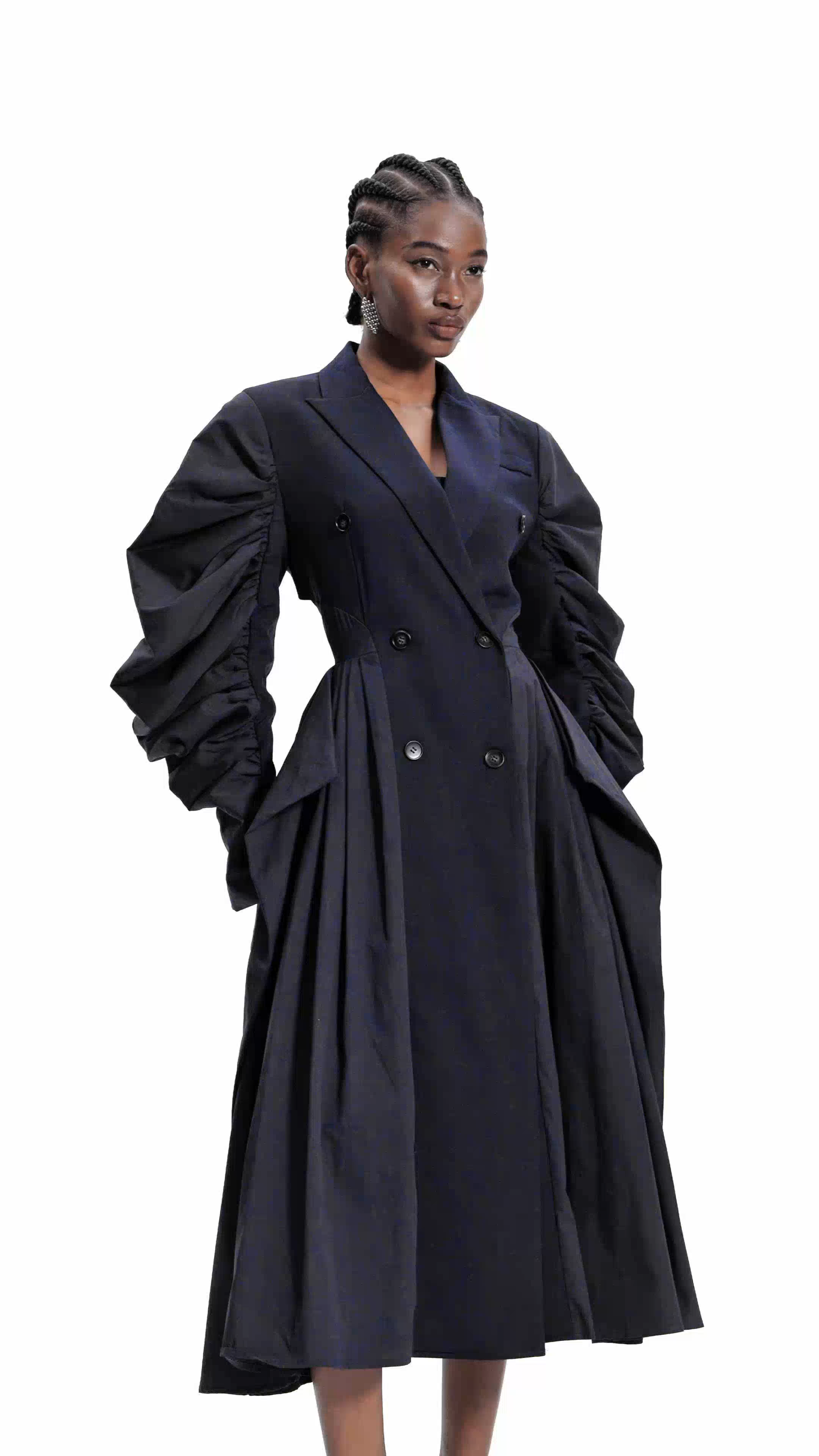 Eerika Ruch Deconstruct Balloon Sleeve Coat This architectural outerwear piece reimagines classic tailoring through strategic deconstruction. The signature balloon sleeves create dramatic volume and movement, while the deconstructed silhouette reveals intentional seaming and layered construction details. Crafted with precision engineering, the coat balances avant-garde design with wearable sophistication. The structured shoulders and flowing sleeve proportions deliver both visual impact and functional comfort. An investment piece for those who appreciate innovative design and elevated everyday wear.