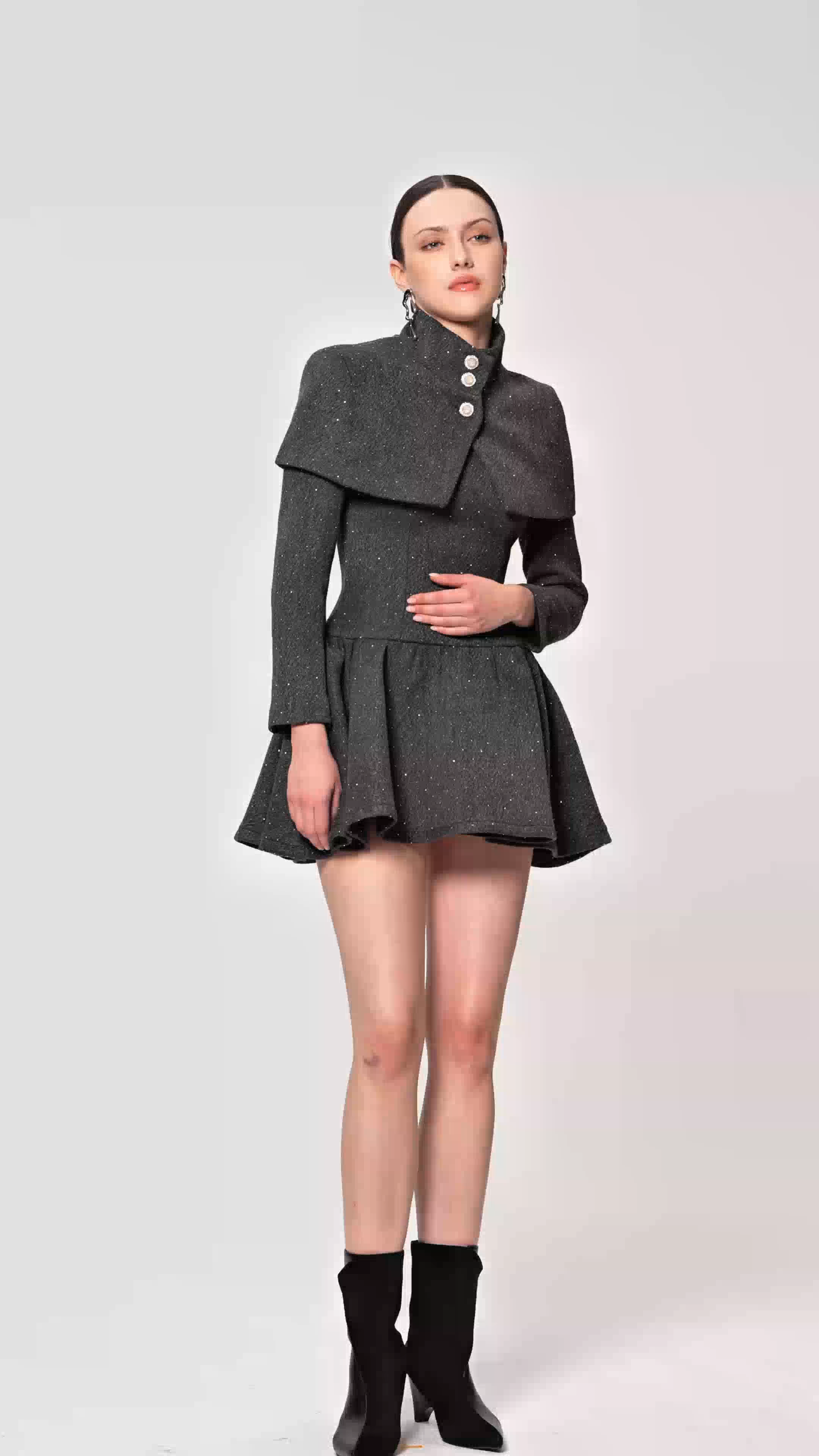 The Eirwen Shawl Ruffle Mini Dress combines sophisticated draping with contemporary silhouette design. Featuring an elegant shawl collar and delicate ruffle detailing, this piece transitions seamlessly from day to evening wear. The mini length offers modern versatility, while the structured ruffle accents add dimension and movement. Crafted for those who appreciate refined tailoring with subtle dramatic flair, this dress delivers polished elegance without compromise.