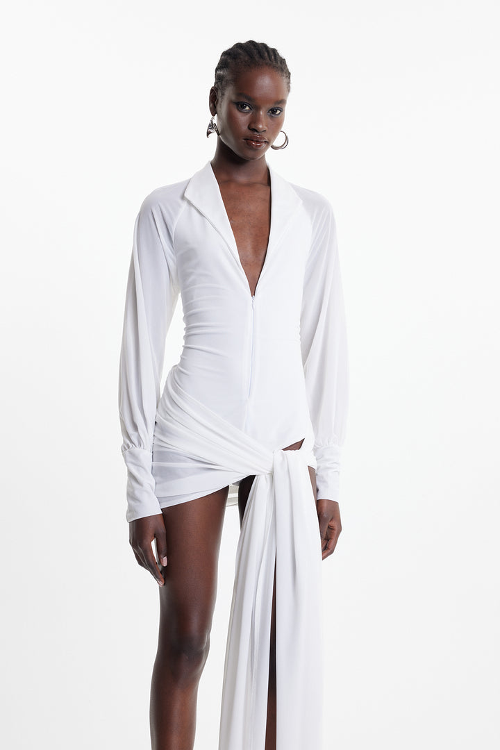 Ekaterina Tie Up Backless Bodysuit The Ekaterina Tie Up Backless Bodysuit combines contemporary design with versatile styling. Featuring an adjustable tie-up closure at the back, this piece offers a customizable fit while showcasing an open back silhouette. The bodysuit construction provides a seamless, tucked-in look that works effortlessly with high-waisted bottoms or layered under sheer pieces. Crafted for those seeking modern sophistication, it transitions smoothly from casual daywear to evening occasions. The strategic cutout design adds visual interest while maintaining wearability and comfort throughout the day.