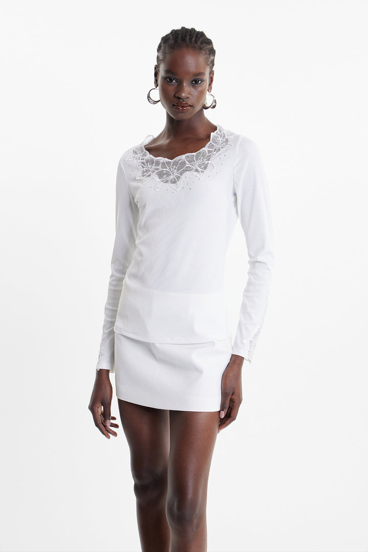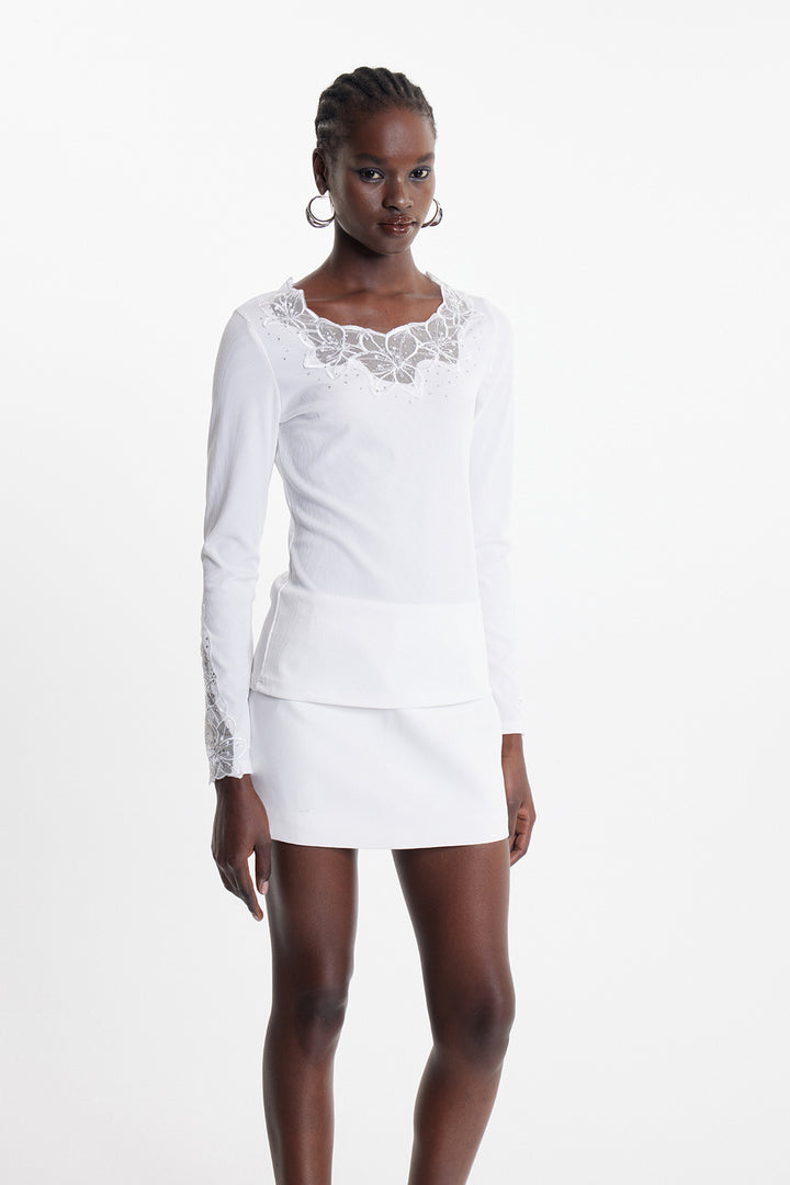 Elevate your evening wardrobe with the Ekaterine Lace Floral Rhinestone Top, a sophisticated piece that seamlessly blends delicate craftsmanship with contemporary glamour. Intricate lace detailing forms an elegant floral pattern across the bodice, while strategically placed rhinestones catch the light for a refined sparkle. The expert construction ensures comfort without compromising on style, making this top an ideal choice for special occasions, upscale dinners, or when you want to make a polished statement. Versatile enough to pair with tailored trousers or a sleek skirt, this piece transforms any ensemble into something memorable.