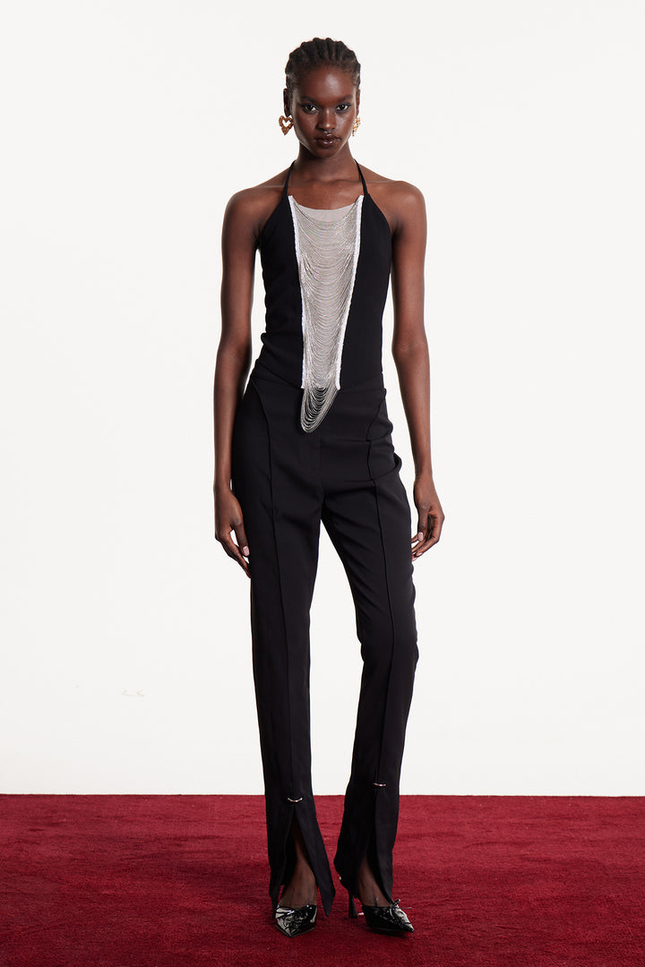 Elevate your evening wardrobe with this sophisticated halter neck top, featuring an elegant pearl chain detail that commands attention. The halter design offers refined support while creating a flattering neckline, perfect for special occasions or upscale gatherings. The lustrous pearl chain embellishment adds a touch of luxury and timeless elegance to any ensemble. Versatile enough to pair with tailored trousers or a flowing skirt, this piece transitions seamlessly from cocktail events to formal dinners. A wardrobe essential for those who appreciate understated glamour and quality craftsmanship.