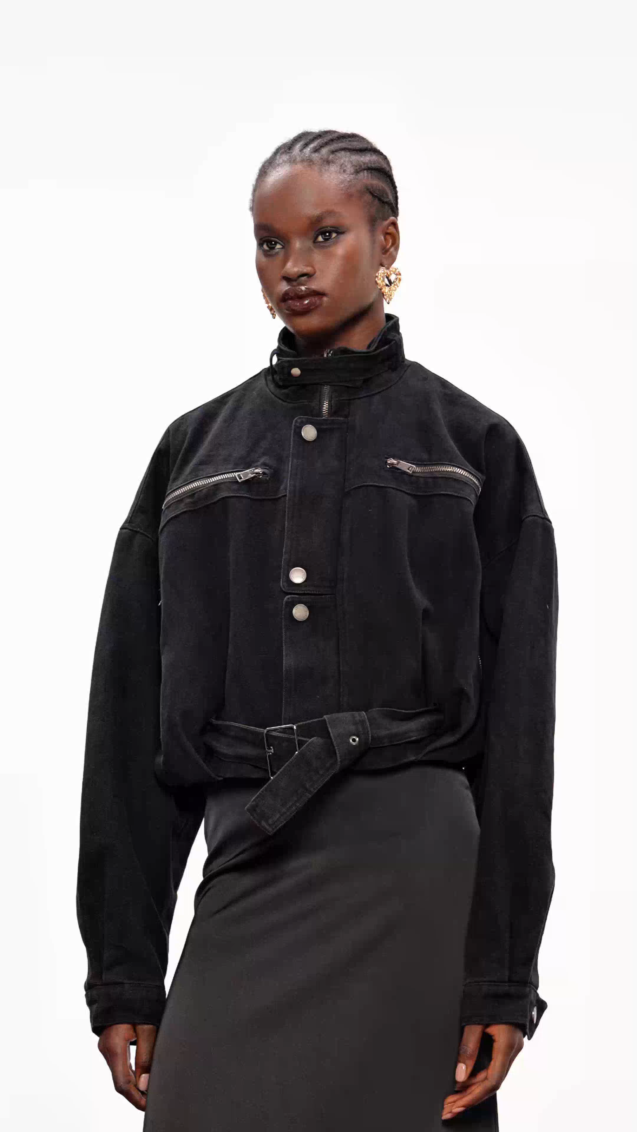 The Eleanor Funnel Neck Crop Denim Jacket combines contemporary silhouette with timeless denim craftsmanship. Its distinctive funnel neckline creates a refined, modern aesthetic while the cropped cut delivers a flattering proportion that works seamlessly with high-waisted bottoms. Constructed from premium denim, this jacket offers durability and structure without sacrificing comfort. The streamlined design makes it versatile enough for layering over dresses or pairing with tailored pieces, while maintaining the polished edge that defines modern denim styling.