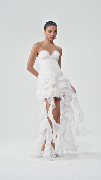 The Eleonore Crystal Ruffle Fringe Mini Dress in White combines refined elegance with contemporary design. Crafted from premium fabric, this piece features delicate ruffle detailing and shimmering crystal embellishments that catch light beautifully. The fringe trim adds movement and dimension, while the mini silhouette offers a modern, flattering cut. Perfect for evening events, cocktail parties, or special occasions, this dress transitions seamlessly from day to night. The white colorway provides versatility for styling with various accessories and footwear. An investment piece that delivers both sophistication and standout appeal.