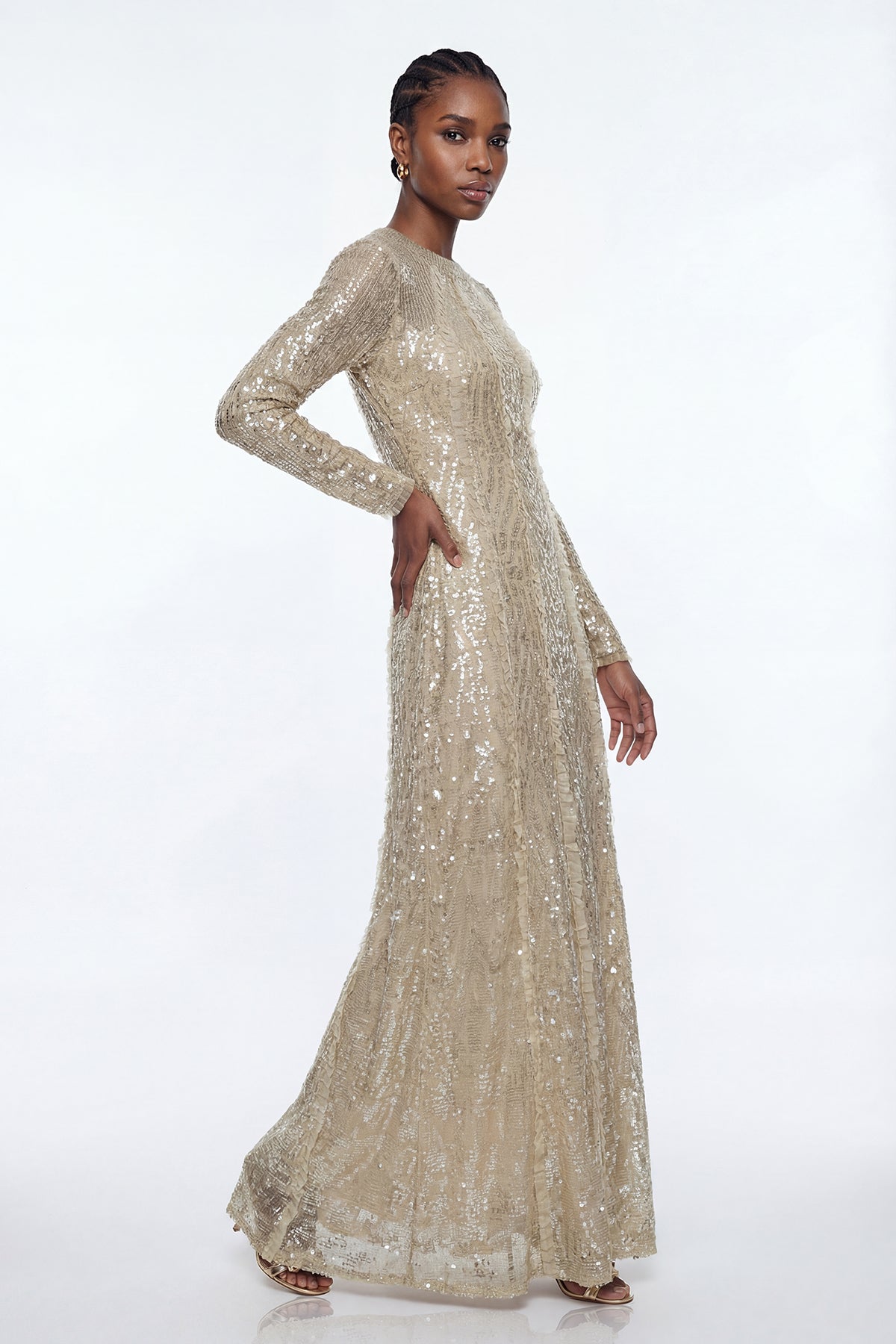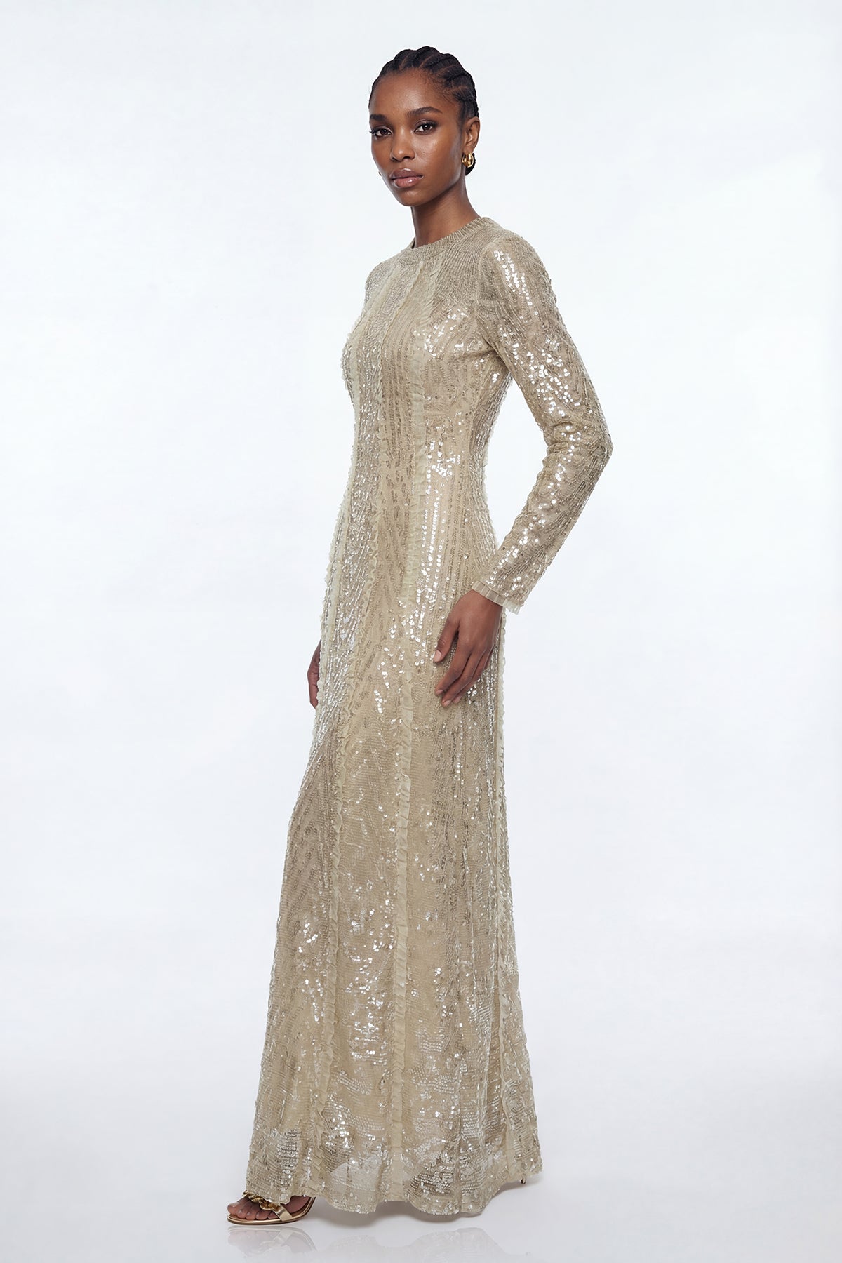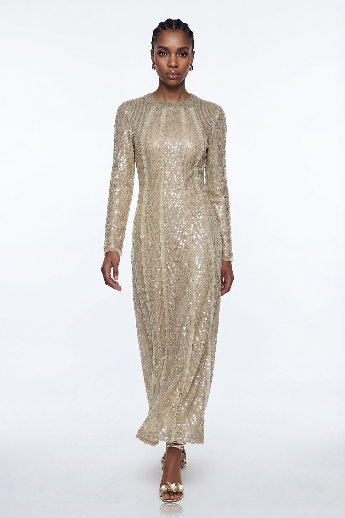 The Eliud Sequin Mesh Maxi Dress combines sophisticated elegance with contemporary design. Crafted from delicate mesh fabric adorned with shimmering sequins, this floor-length silhouette delivers refined glamour for evening occasions. The flowing maxi cut provides graceful movement and flattering proportions, while the sequin detailing catches light beautifully throughout the night. Perfect for galas, formal events, or upscale celebrations, this dress makes a striking statement piece that transitions seamlessly from cocktail hour to dancing.