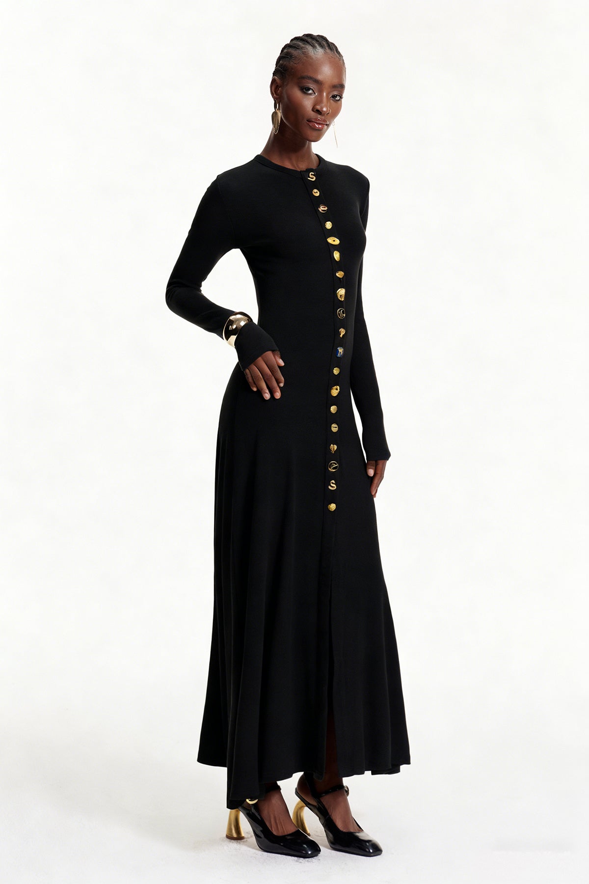 Elevate your evening wardrobe with the Elodie Button Ruffle Maxi Dress in Black. This sophisticated piece features delicate ruffle detailing and a refined button-front closure that adds dimension and visual interest. The flowing maxi silhouette offers graceful movement and timeless elegance, making it an ideal choice for formal occasions, upscale dinners, or special events. Crafted with attention to detail, this dress combines classic design elements with contemporary styling for a versatile addition to any collection.