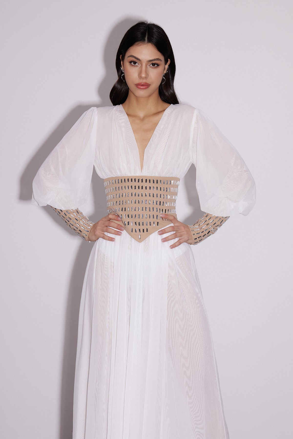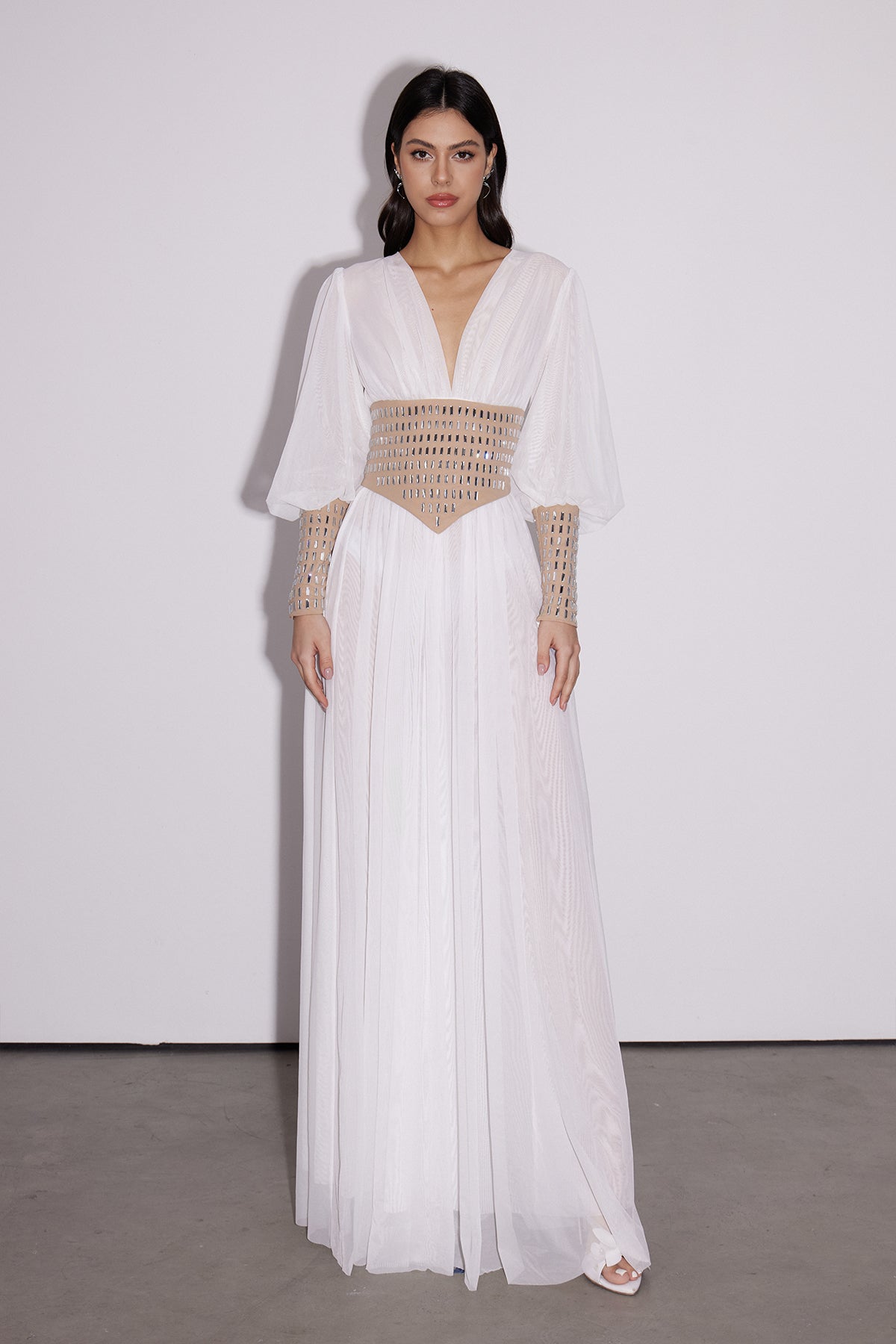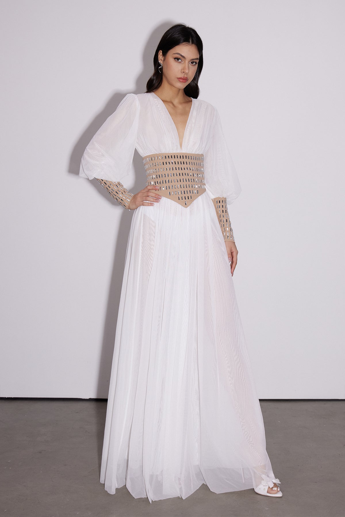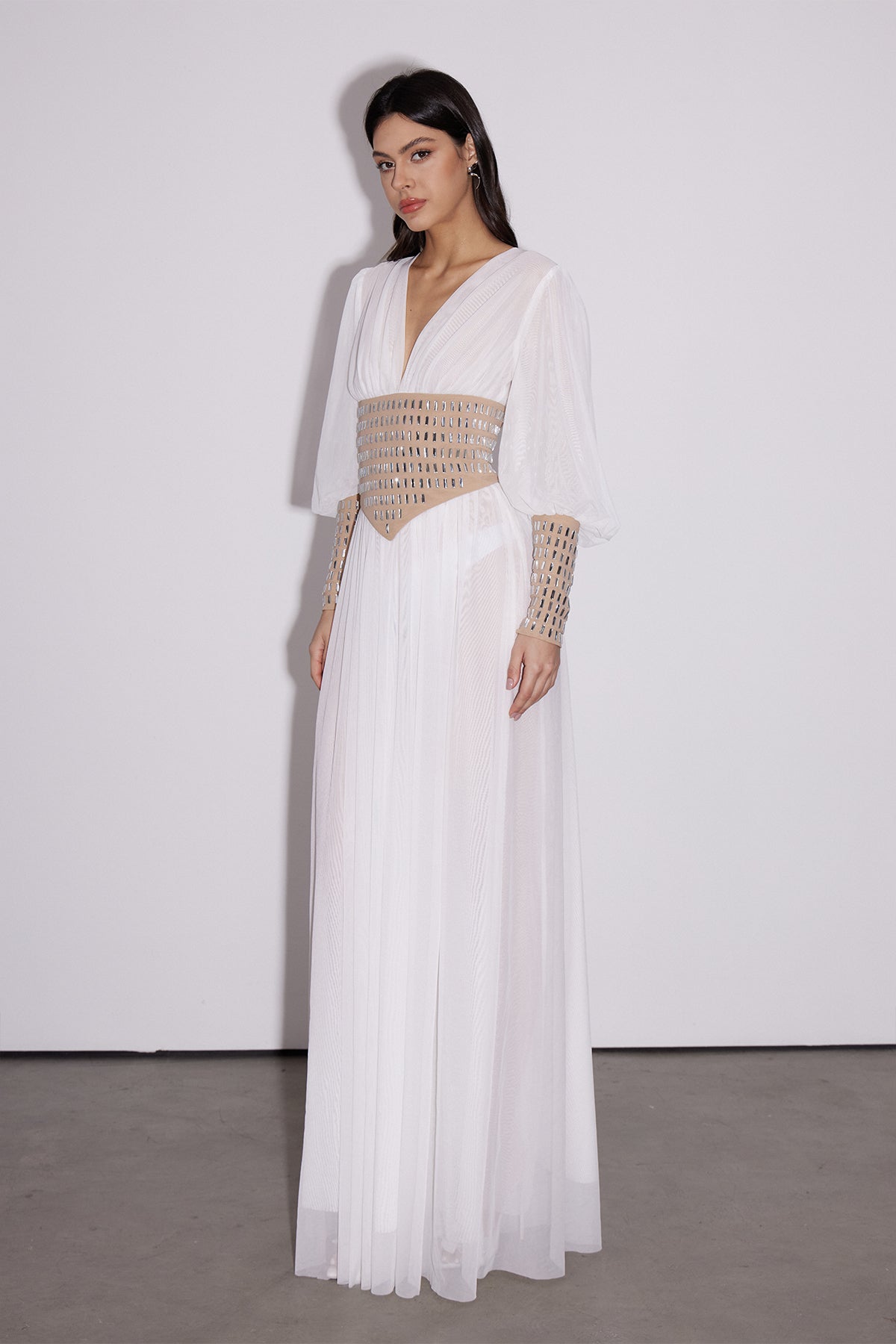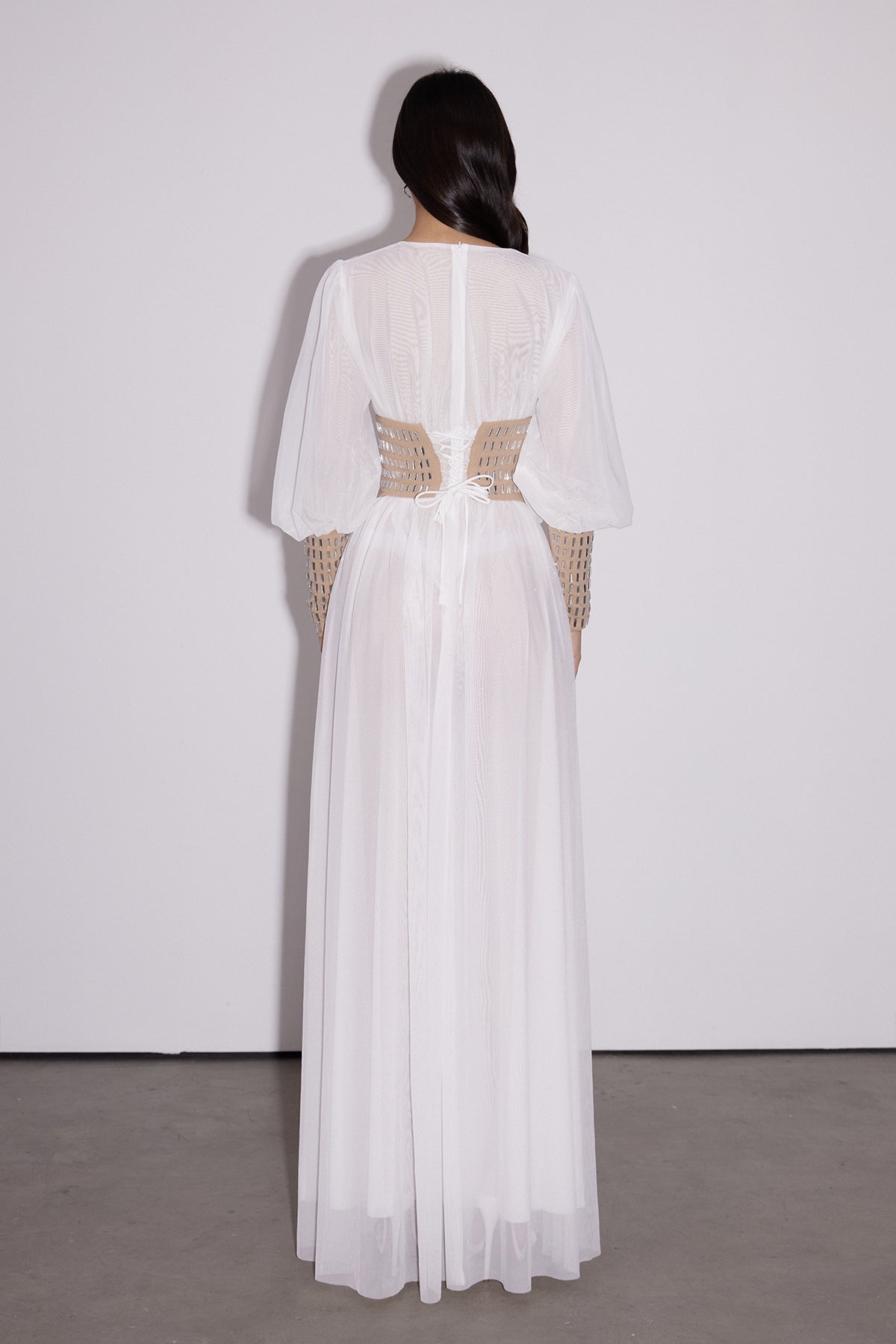 The Elya Crystal Mesh Maxi Dress combines sophisticated elegance with contemporary design. Crafted from delicate crystal mesh fabric, this floor-length silhouette offers a refined aesthetic perfect for evening events, galas, or upscale occasions. The sheer mesh construction creates an ethereal quality while maintaining an understated glamour. The maxi length provides graceful movement and versatile styling options, whether layered over slip dresses or worn as a statement piece. An ideal choice for those seeking timeless sophistication with modern sensibility.