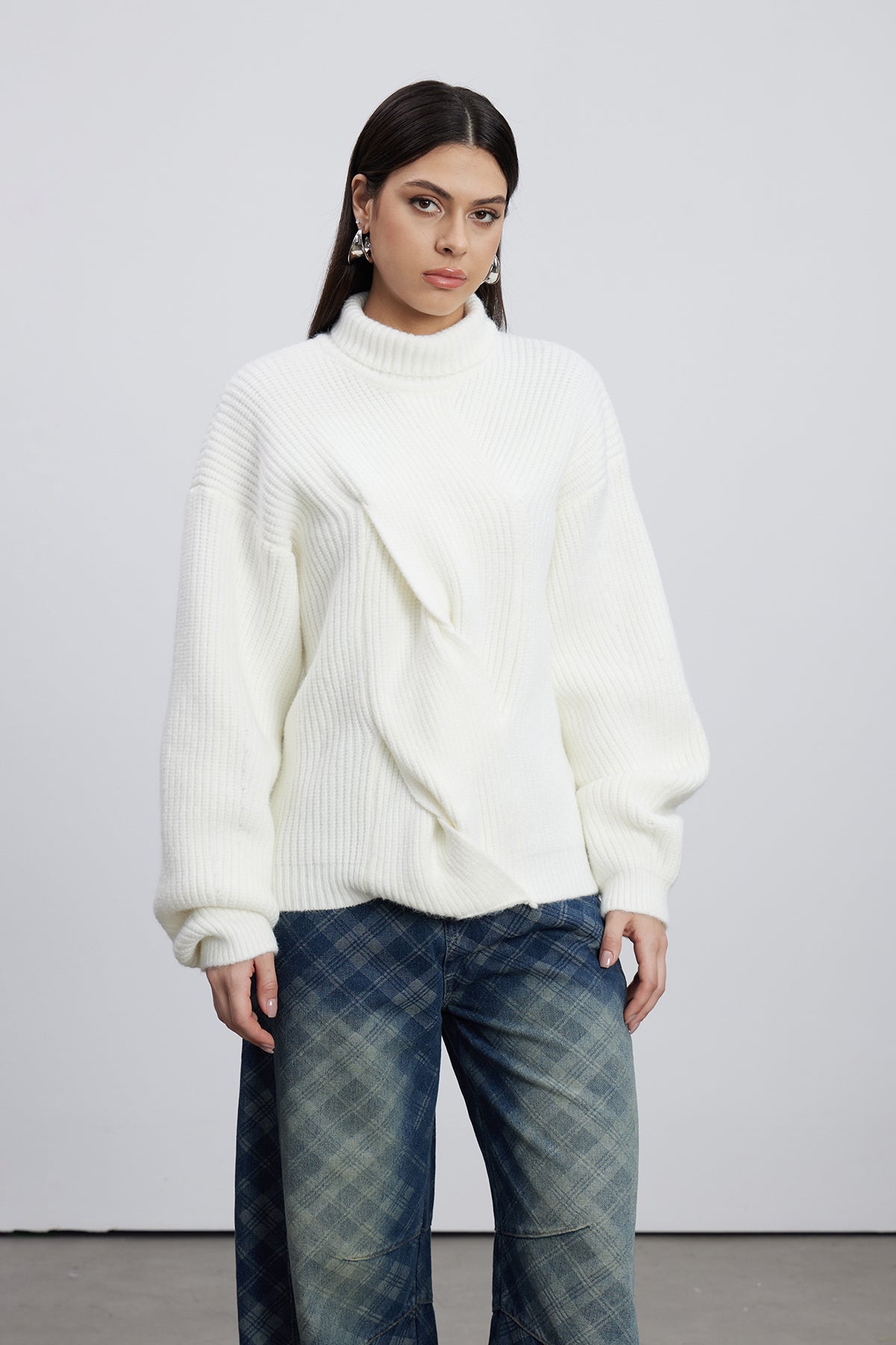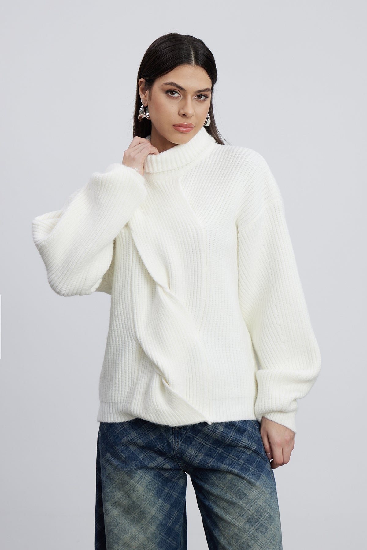 The Emel Turtleneck Twist Knit Top in White combines refined craftsmanship with contemporary design. This piece features a distinctive twisted knit construction that adds visual depth and textural interest to your wardrobe. The classic turtleneck silhouette provides timeless versatility, while the crisp white colorway ensures effortless pairing with any ensemble. Crafted for comfort and durability, this top transitions seamlessly from casual weekday wear to elevated weekend styling. An essential layering piece that delivers both sophistication and practicality.