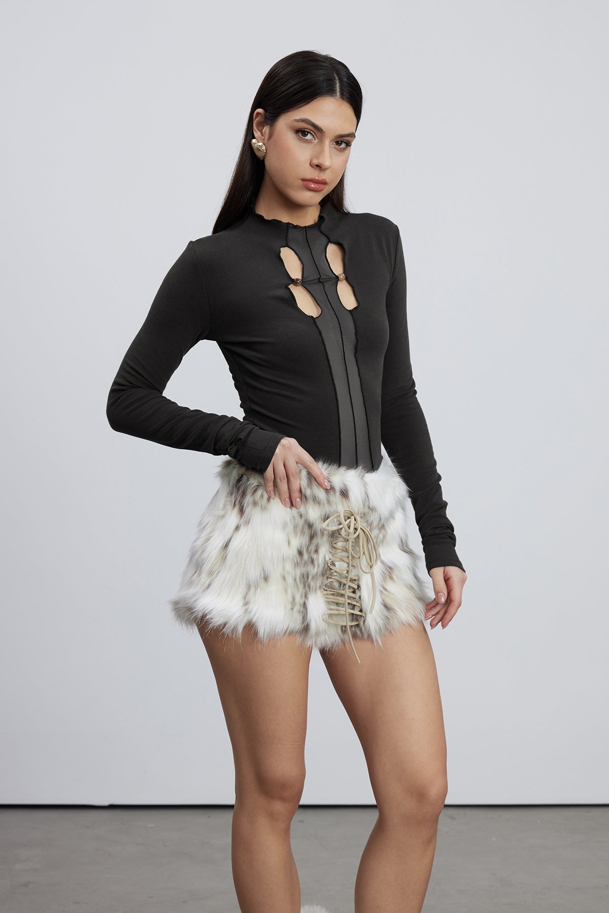 Emelina Mesh Cutout Top In Black Elevate your wardrobe with the Emelina Mesh Cutout Top, a sophisticated piece that balances contemporary design with timeless appeal. Crafted from premium mesh fabric, this top features strategically placed cutouts that create visual interest while maintaining an air of refined elegance. The black colorway offers versatility, pairing effortlessly with denim, tailored trousers, or skirts for both casual and elevated occasions. The breathable mesh construction ensures comfort throughout the day, while the cutout detailing adds a modern edge to your styling options. Perfect for those seeking a statement piece that doesn't compromise on wearability.