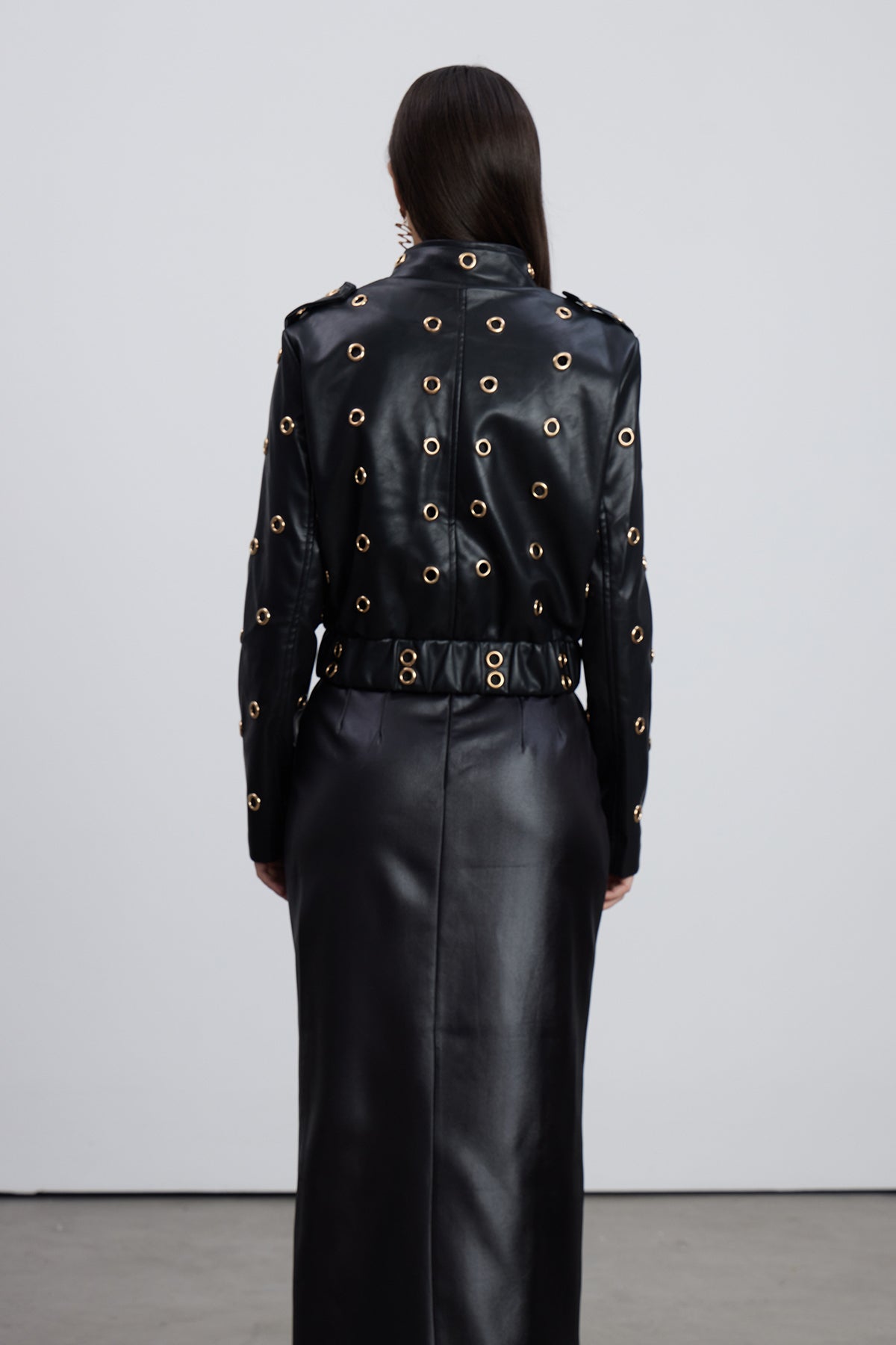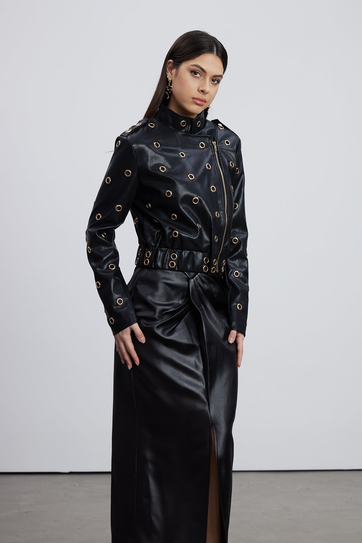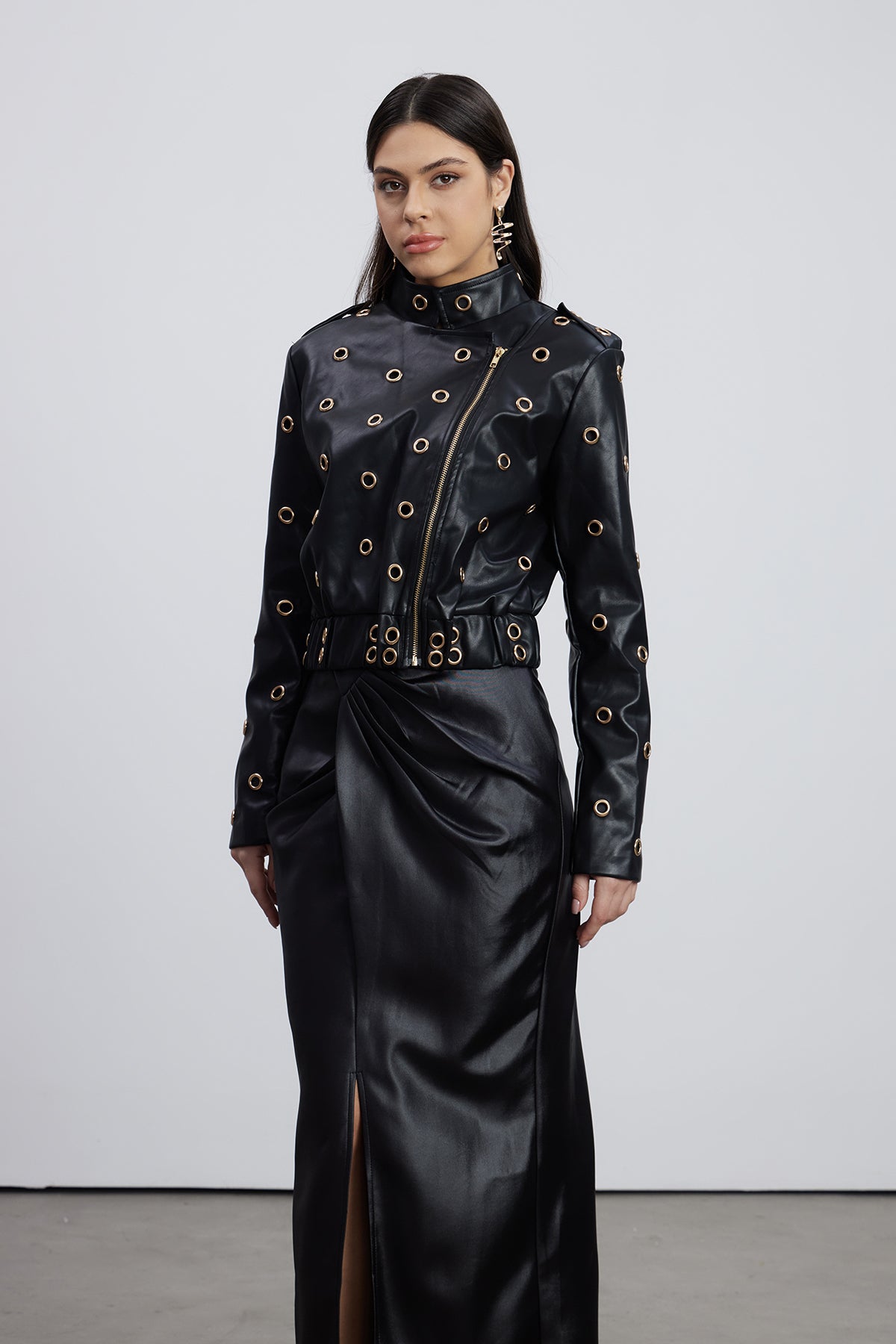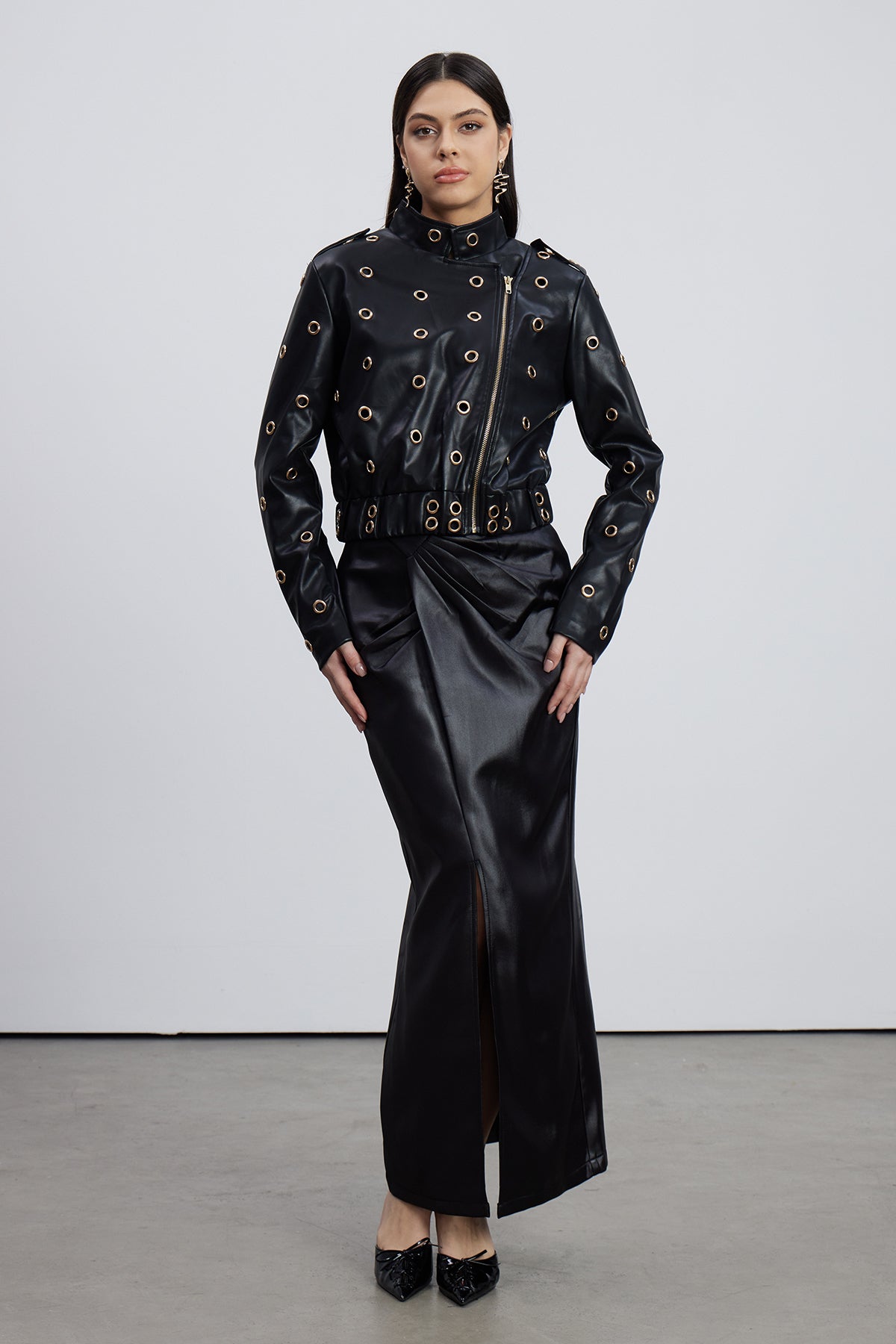 The Emeterius Eyelet Leather Jacket in Black combines timeless craftsmanship with contemporary edge. Constructed from premium leather, this jacket features distinctive eyelet detailing that adds visual interest and structural integrity. The classic black colorway ensures versatility across seasons and occasions, while the refined silhouette works seamlessly with both casual and elevated wardrobes. Built to develop character with wear, this investment piece delivers enduring style and durability for discerning denim enthusiasts.
