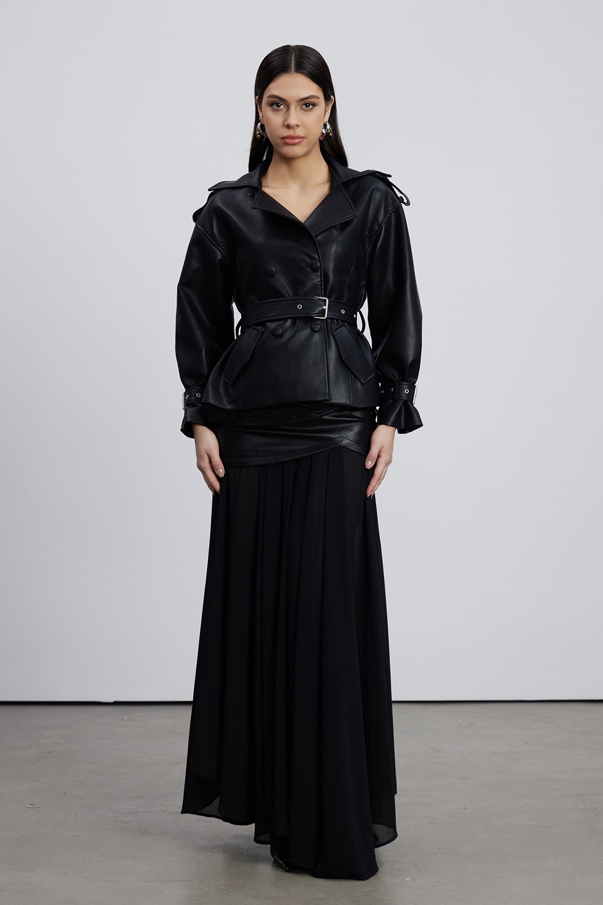 The Emili Cropped Trench Leather Jacket merges timeless tailoring with contemporary silhouettes. Crafted from premium leather, this cropped trench features structured shoulders and a refined collar that commands attention. The shortened hemline modernizes the classic trench aesthetic, making it versatile enough for layering over dresses or pairing with high-waisted trousers. Double-breasted closure and functional pockets deliver both style and practicality. An essential investment piece that transitions seamlessly from office to evening wear.