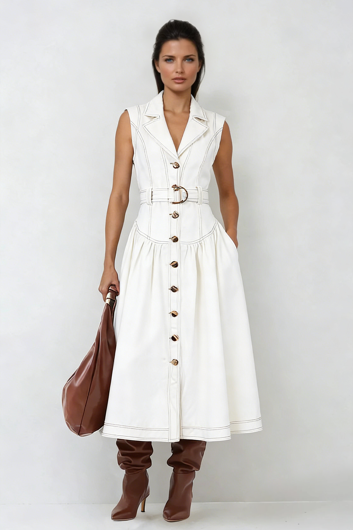 The Emmanuel Sleeveless Denim Midi Dress in White exemplifies refined denim design with its streamlined construction and sophisticated proportions. Crafted in pristine white denim, this sleeveless midi delivers understated elegance through its minimalist aesthetic and impeccable tailoring. The dress's versatile silhouette accommodates layering for cooler seasons while standing beautifully on its own during warmer months. Its midi length strikes the perfect balance between polished and approachable, making it equally at home in professional settings or casual weekend outings. A foundational piece that elevates any wardrobe through its timeless appeal and exceptional quality.