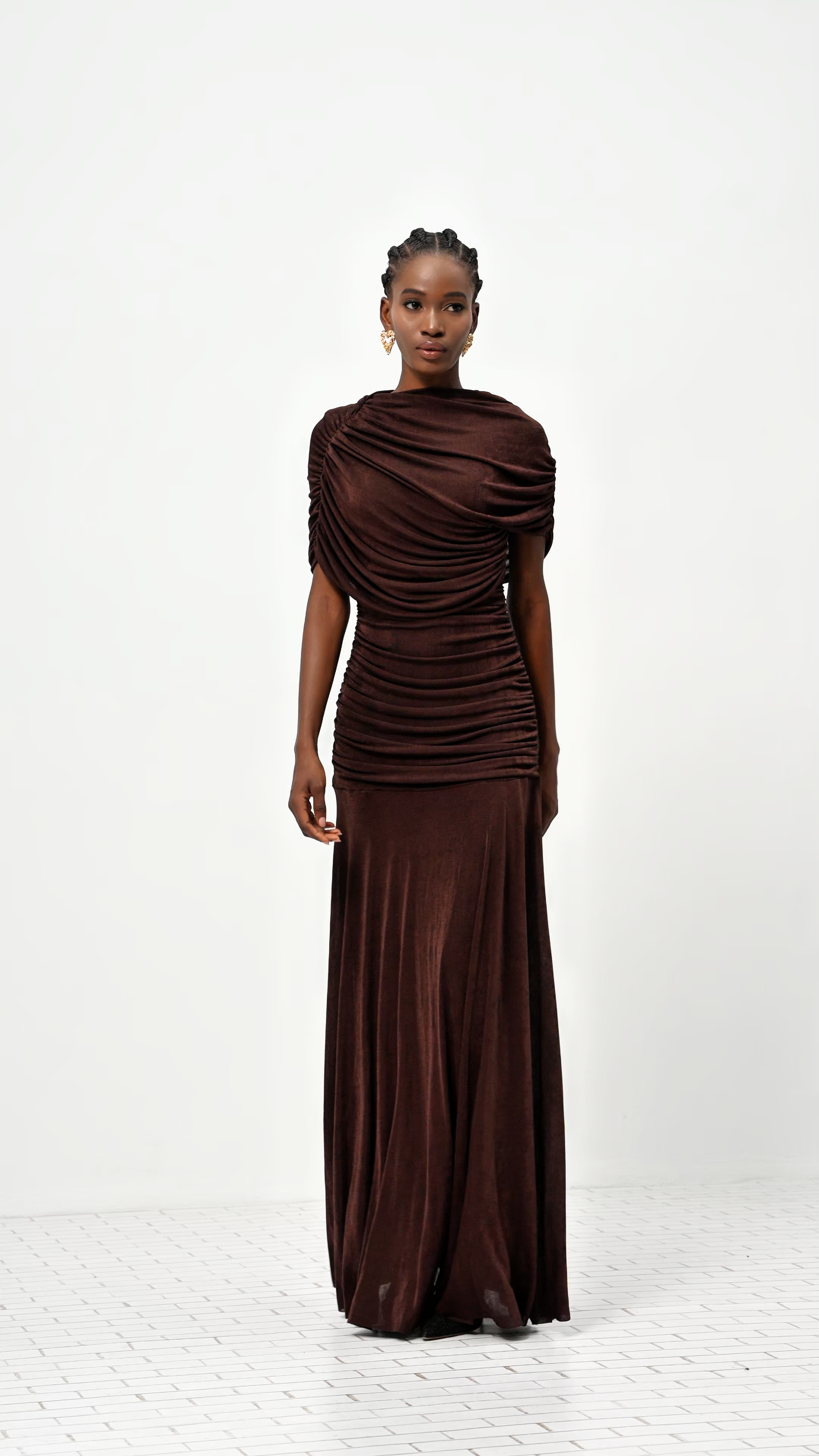 The Erla Draped Maxi Dress in Brown offers timeless elegance with its flowing silhouette and sophisticated draping. Crafted for versatility and comfort, this dress seamlessly transitions from day to evening wear, making it an ideal choice for modern wardrobes.
