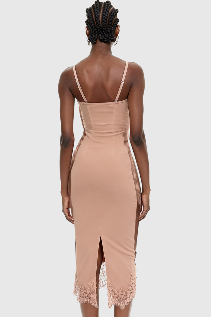 The Faizel Spaghetti Corset Lace Midi Dress combines structured elegance with delicate femininity. Featuring a fitted corset bodice that sculpts and supports, paired with intricate lace detailing that adds sophistication and movement. The spaghetti straps provide a refined silhouette while the midi length offers versatility for both evening occasions and elevated daytime wear. Crafted for those who appreciate tailored construction and timeless design, this piece transitions seamlessly from special events to refined everyday styling.