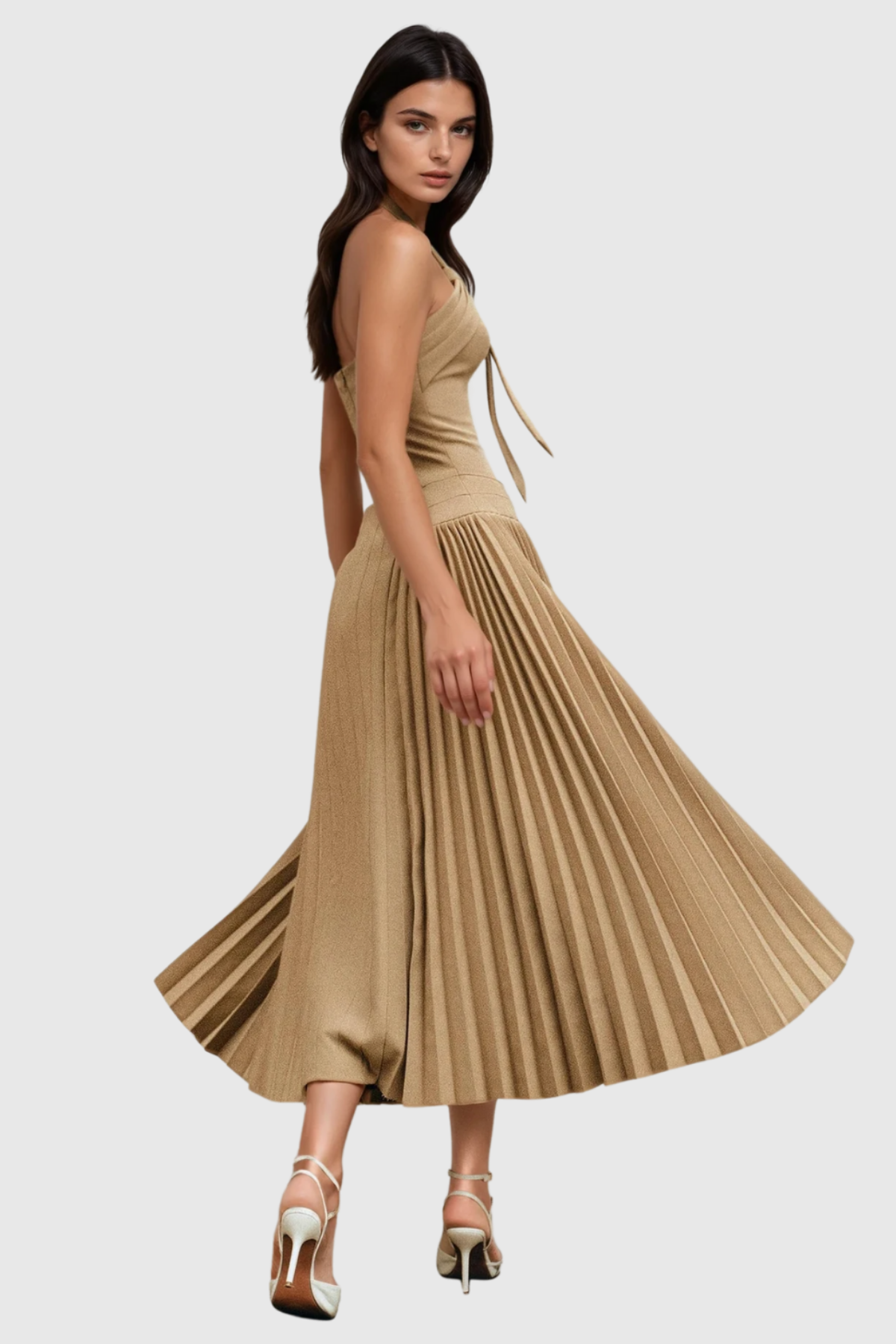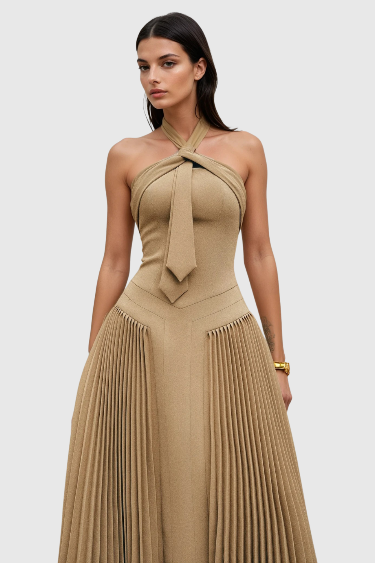 The Faramund Halter Neck Pleated Maxi Dress combines architectural elegance with refined sophistication. The halter neckline creates a striking silhouette while the cascading pleats add movement and dimension throughout the floor-length skirt. Crafted for those who appreciate tailored details, this dress transitions seamlessly from evening events to upscale occasions. The structured bodice provides support and definition, while the flowing maxi length offers timeless appeal. A versatile investment piece that commands attention through understated craftsmanship.