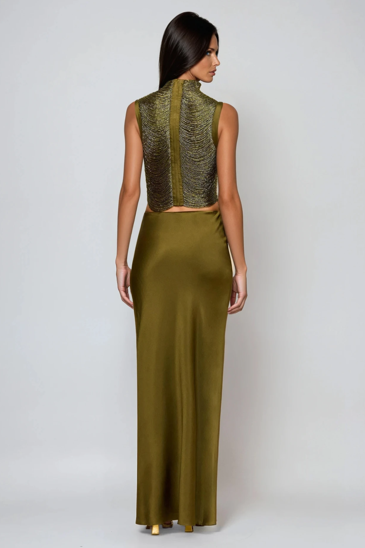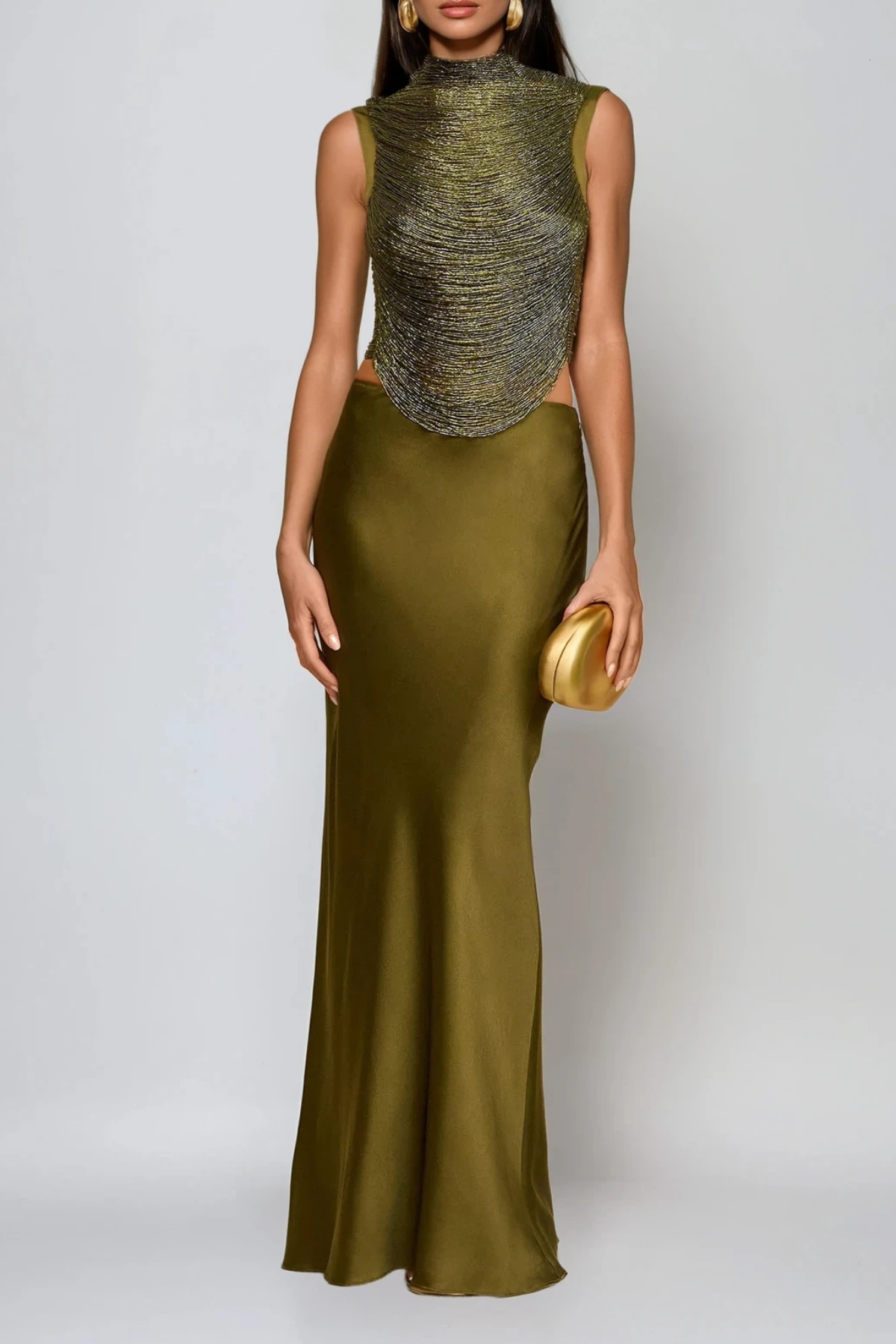 Elevate your wardrobe with the Fedde Fringe Satin Skirt Set in Olive. This sophisticated two-piece ensemble features luxurious satin construction paired with delicate fringe detailing, creating a refined silhouette with movement and texture. The rich olive tone offers versatile styling options for both contemporary and classic occasions. Perfect for those seeking elevated basics that transition seamlessly from day to evening wear, this set delivers understated elegance with thoughtful design elements that distinguish it from standard separates.
