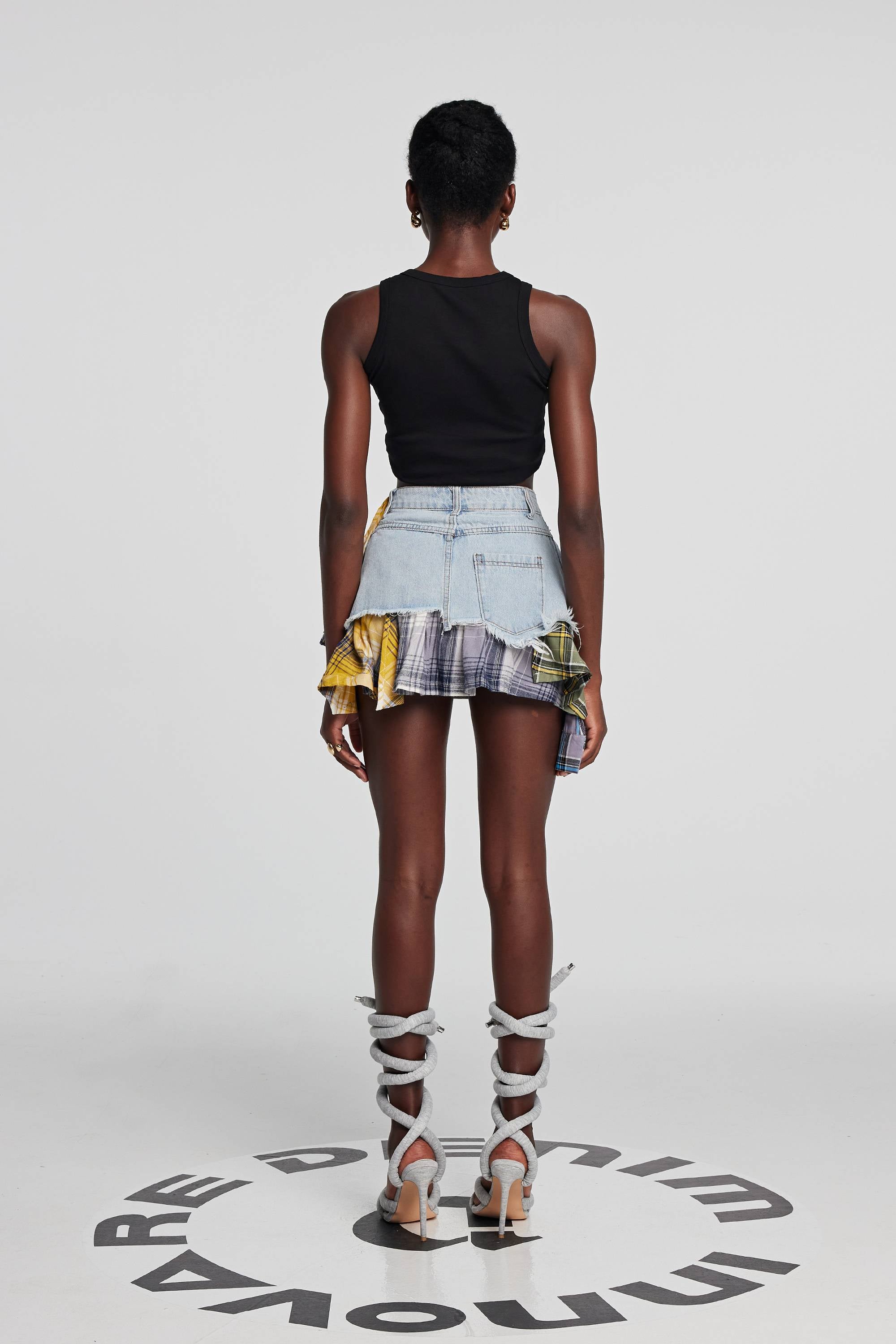 Introducing the Kenna Grid Deconstruct Patchwork Mini Skirt In Blue, a unique and stylish addition to your wardrobe. Made with high-quality materials, this mini skirt features a grid deconstruct patchwork design that is both eye-catching and fashion-forward. A must-have for any fashionista looking to make a statement.