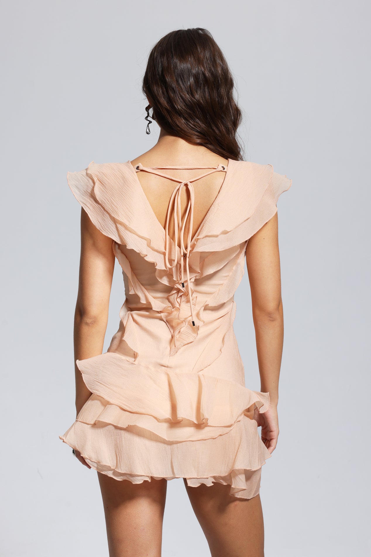 Expertly crafted, the Maura V Neck Ruffle Asymmetric Mini Dress is a sophisticated addition to any wardrobe. With a flattering V-neckline, ruffled details, and an asymmetric hemline, this dress offers a chic and elegant look. The luxurious champagne color adds a touch of glamour, perfect for any special occasion.