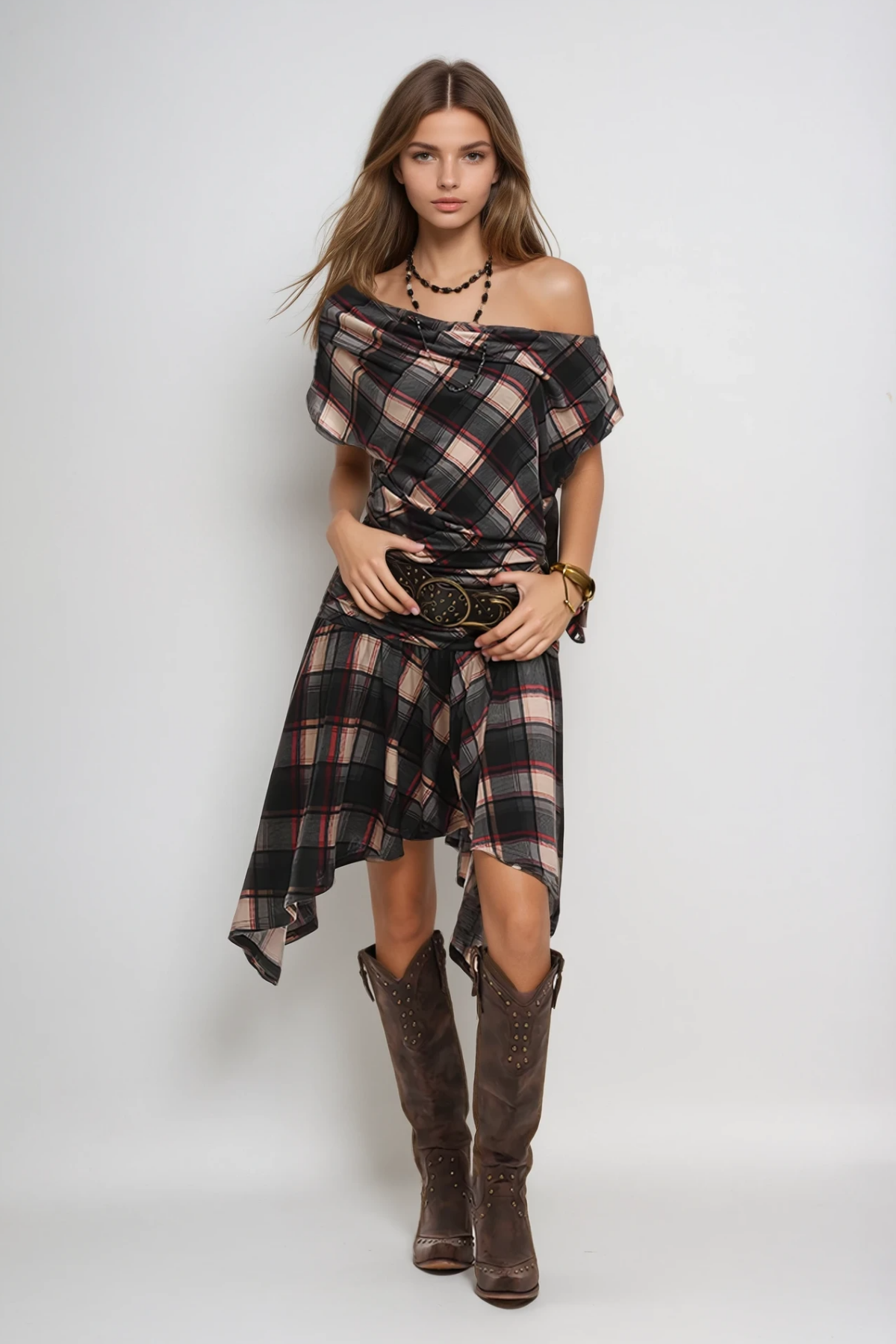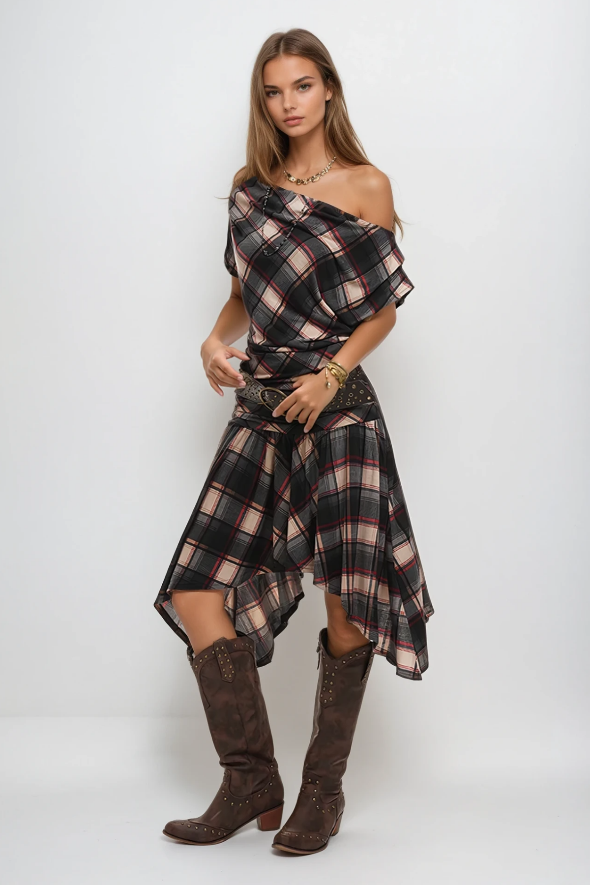 Waldo Grid One Shoulder Asymmetric Midi Dress