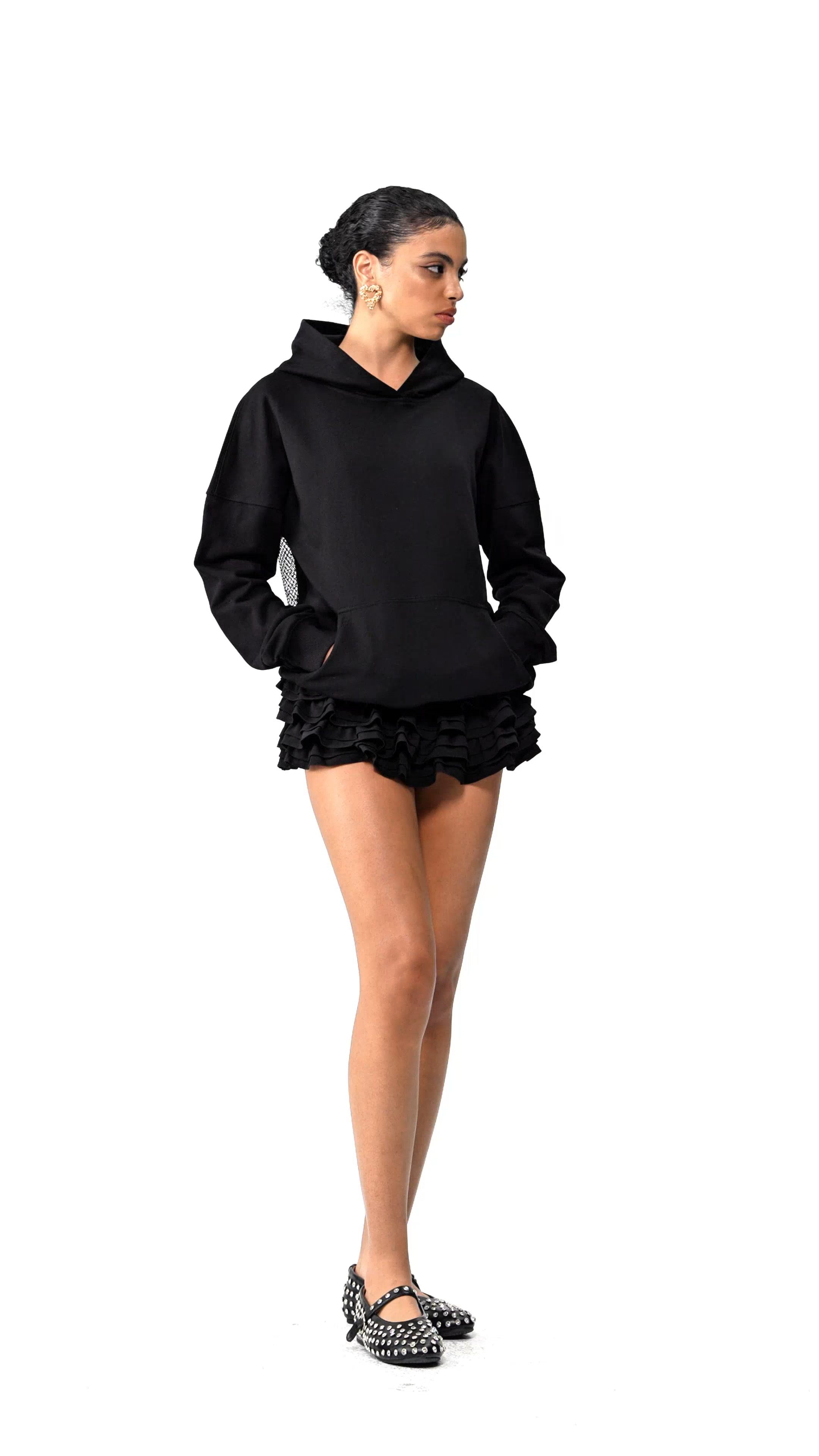 Elevate your wardrobe with the Dazhbog Hooded Rhinestone Mesh Top in Black. Expertly crafted from sheer mesh fabric, this top combines effortless breathability with a bold, modern aesthetic. The hood adds a sporty edge, while the rhinestone embellishments introduce a subtle yet striking sparkle, perfect for layering or standout styling. Ideal for those seeking to blend comfort with avant-garde fashion, this top offers versatility from daywear to evening looks.